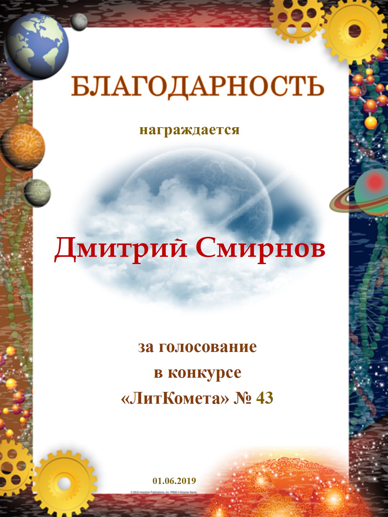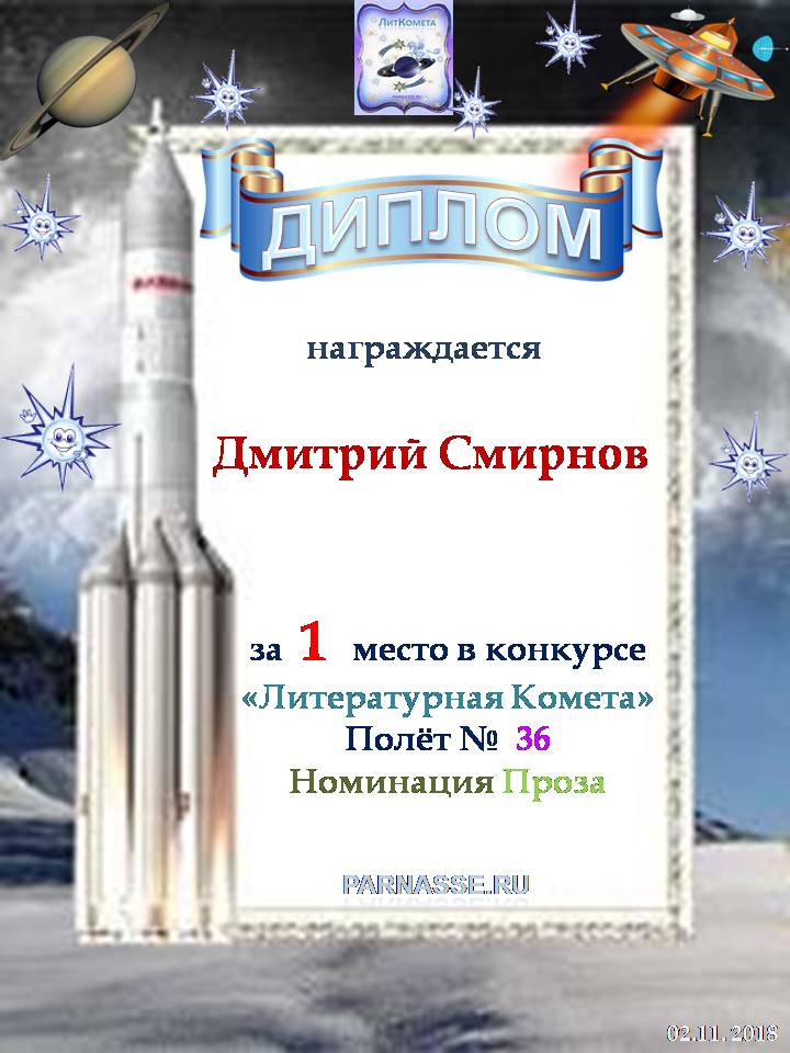 Вручается за 3 место в конкурсе "Литературная Комета - Полёт № 50" - Номинация Проза