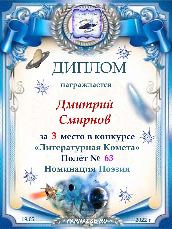 Поздравляю с занятым 3 местом в конкурсе "Литературная Комета - Полёт № 59" Номинации Поэзия!