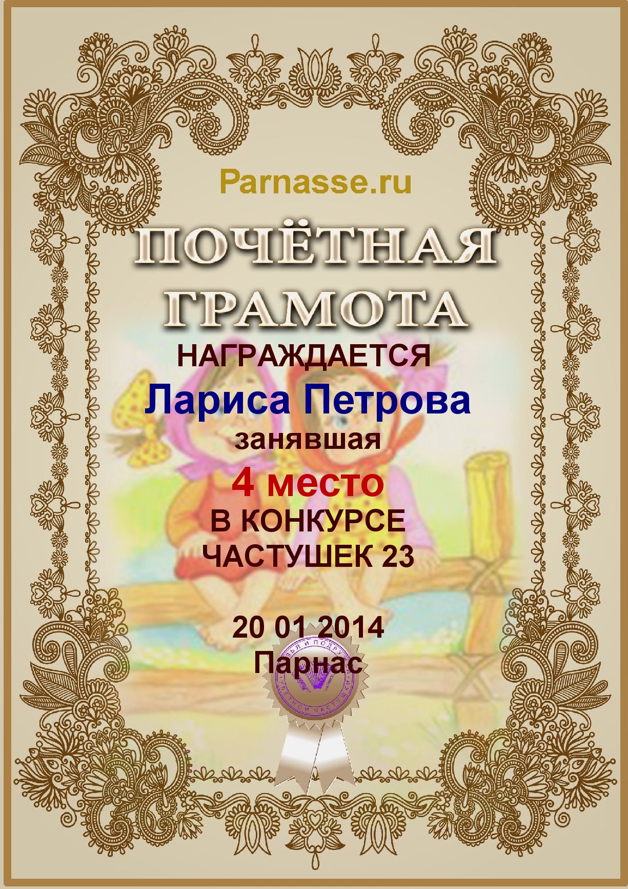 От лица Администрации творческого портала "Парнас" вручаем Вам этот памятный знак с самыми наилучшими пожеланиями! Пусть Вас весь год не покидает творческий запал, удача, а здоровье будет столь же крепким и нерушимым, как и традиция Новогоднего праздника! Счастья, успехов и любви Вам и Вашей семье, друзьям и близким!