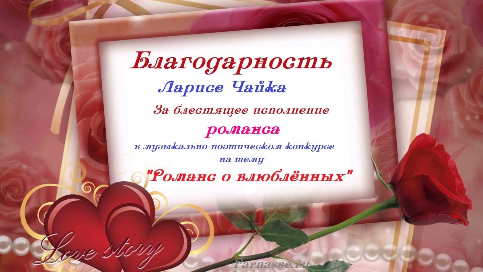 За прекрасное исполнение песни в конкурсе "РОМАНС О ВЛЮБЛЁННЫХ".