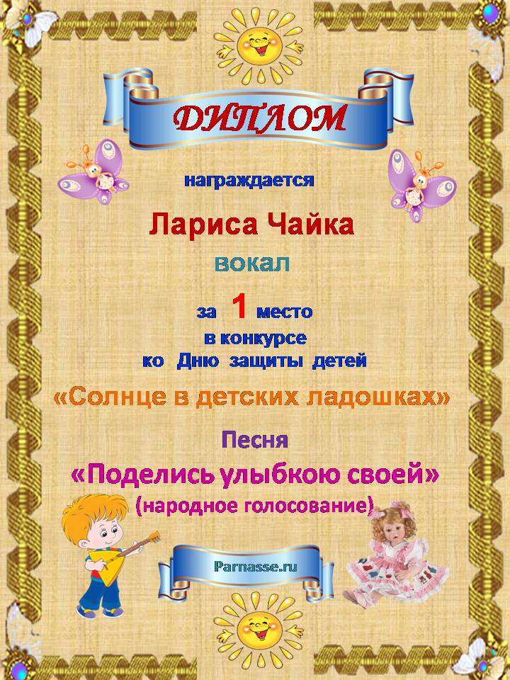 За пятое место в конкурсе, посвященном Дню защиты детей. Народное голосование. Песенная Номинация "Поделись улыбкою своей". Великолепное сопровождение чудесной песни "С Днём Рождения, Февралька!". Поздравляем с прекрасной победой.