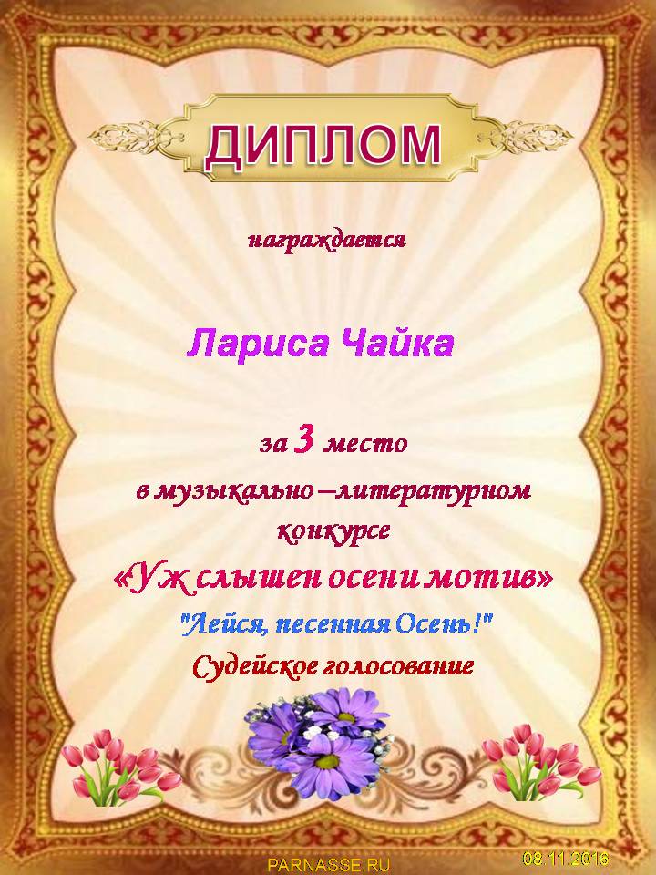 Третье место в конкурсе "Уж слышен Осени мотив" в песенной номинации "Лейся, песнь любви моей!", судейское голосование. Поздравляем с победой. Благодарим за очаровательные стихи к песне "С осенью- подружкой".