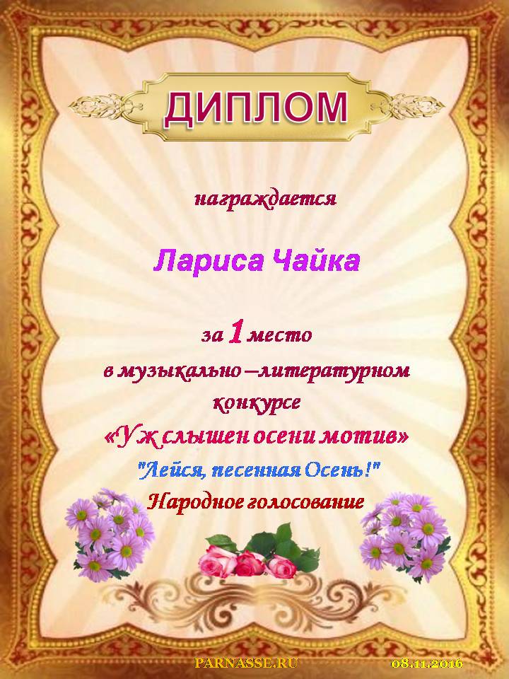 Первое место в конкурсе "Уж слышен Осени мотив" в песенной номинации "Лейся, песнь любви моей!", народное голосование. Поздравляем с красивой победой. Благодарим Вас, Лариса, за великолепные стихи к песне "С осенью- подружкой".