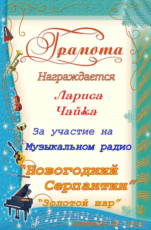 Второе место в музыкально-литературном конкурсе "Предновогодний Вкусный" в песенной номинации "Вкусные песни - песенный рецепт", судейское голосование. Поздравляем с красивой победой. Благодарим Вас, Лариса, за восхитительное исполнение прекрасной песни "Салат "Новогодняя ночь"". От всей души поздравляем Вас с наступающим Новым 2017 Годом! Счастья и радости, здравия и всех благ, удачи на все года! Спасибо Вам за душевные песни!