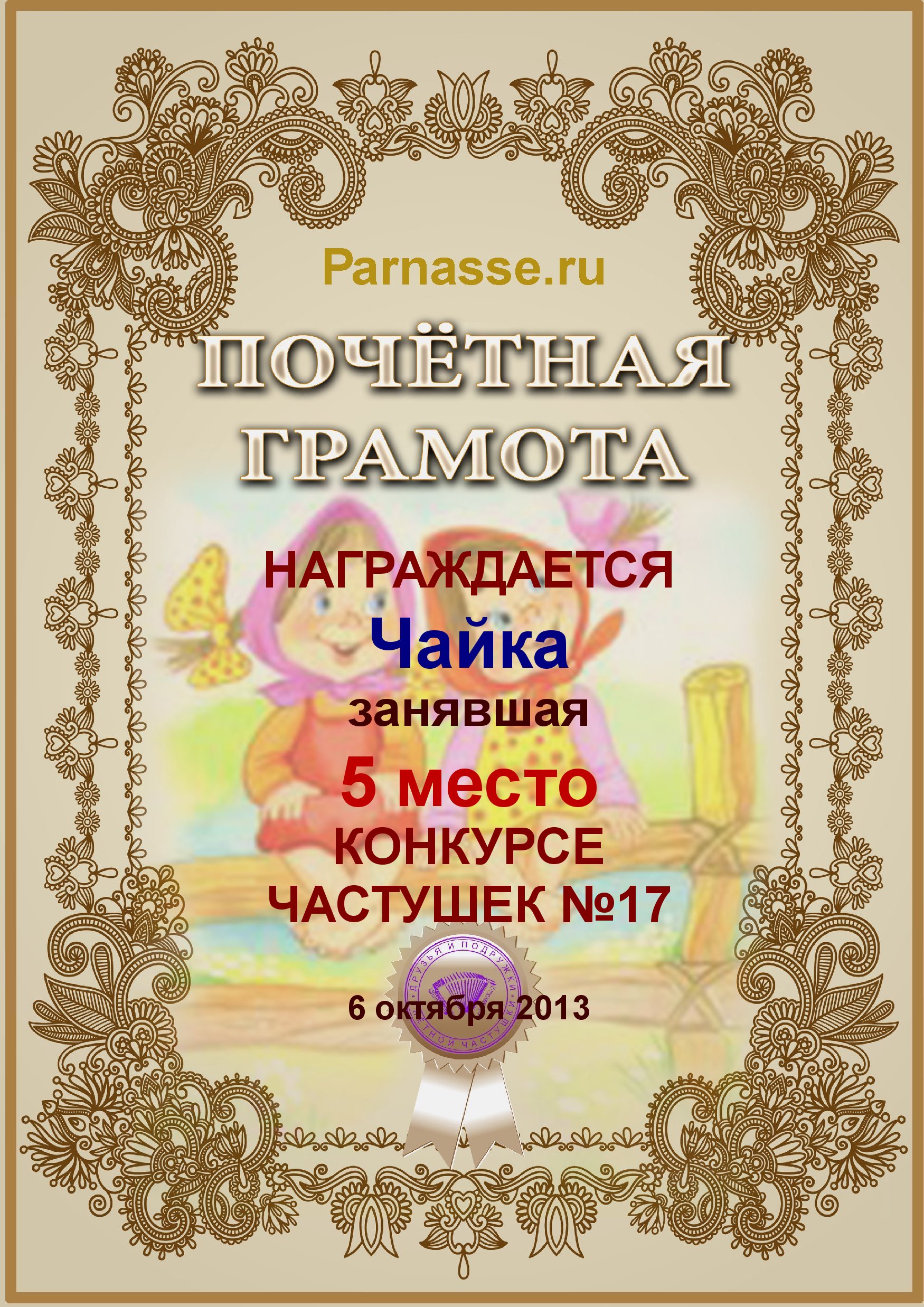 Первое место в праздничном конкурсе "Поздравим Парнас вместе!", в номинации "Лучшая поздравительная песнь Парнасу". Трёхлетний юбилей Парнаса - наш общий Праздник. Примите и Вы наши поздравления и пожелания крепкого Здоровья, Счастья, Вдохновения и творческих Открытий! Спасибо Вам огромное за великолепное музыкальное поздравление, пусть Ваша Муза всегда остается рядом, а Вы – с "Парнасом" на долгие и долгие годы! Произведение "Парнас, с Днем Рождения!!! (Совместная работа с Мартой Шаула)."