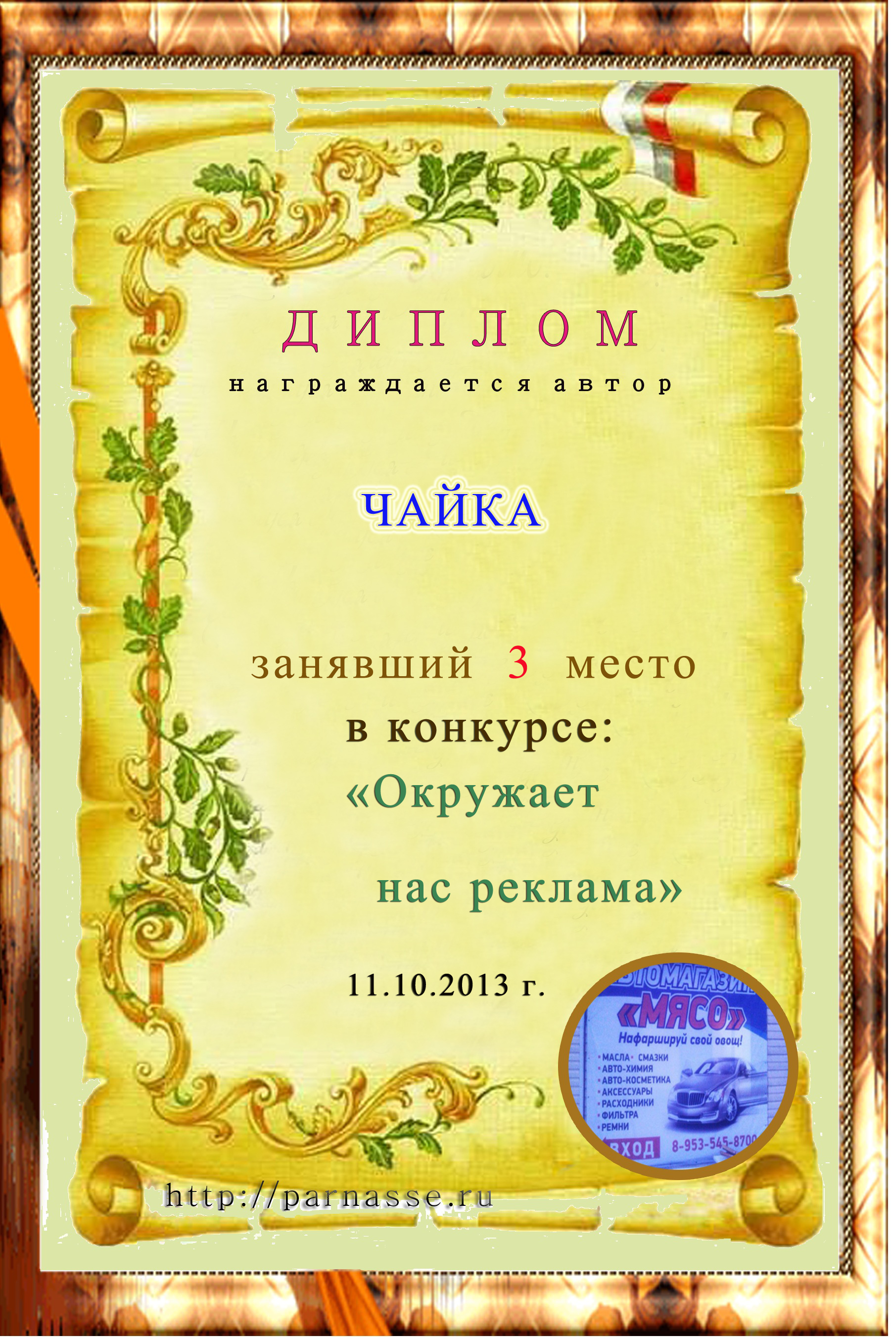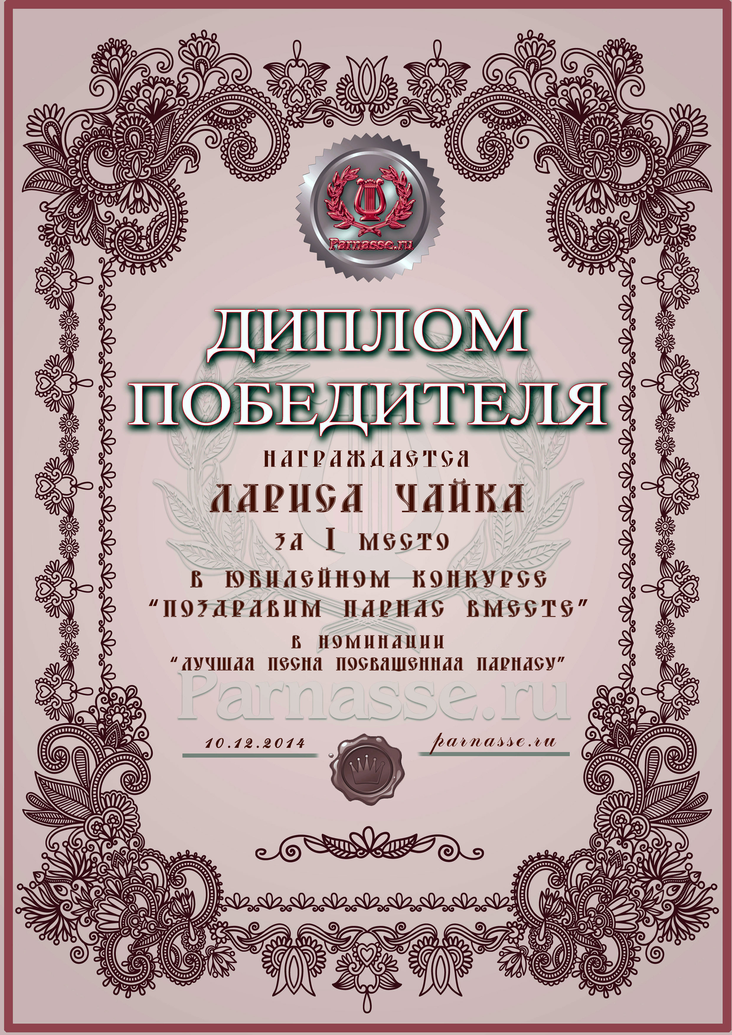 Диплом Победителя за 1 место в праздничном конкурсе "Поздравим Парнас с трёхлетием вместе!"