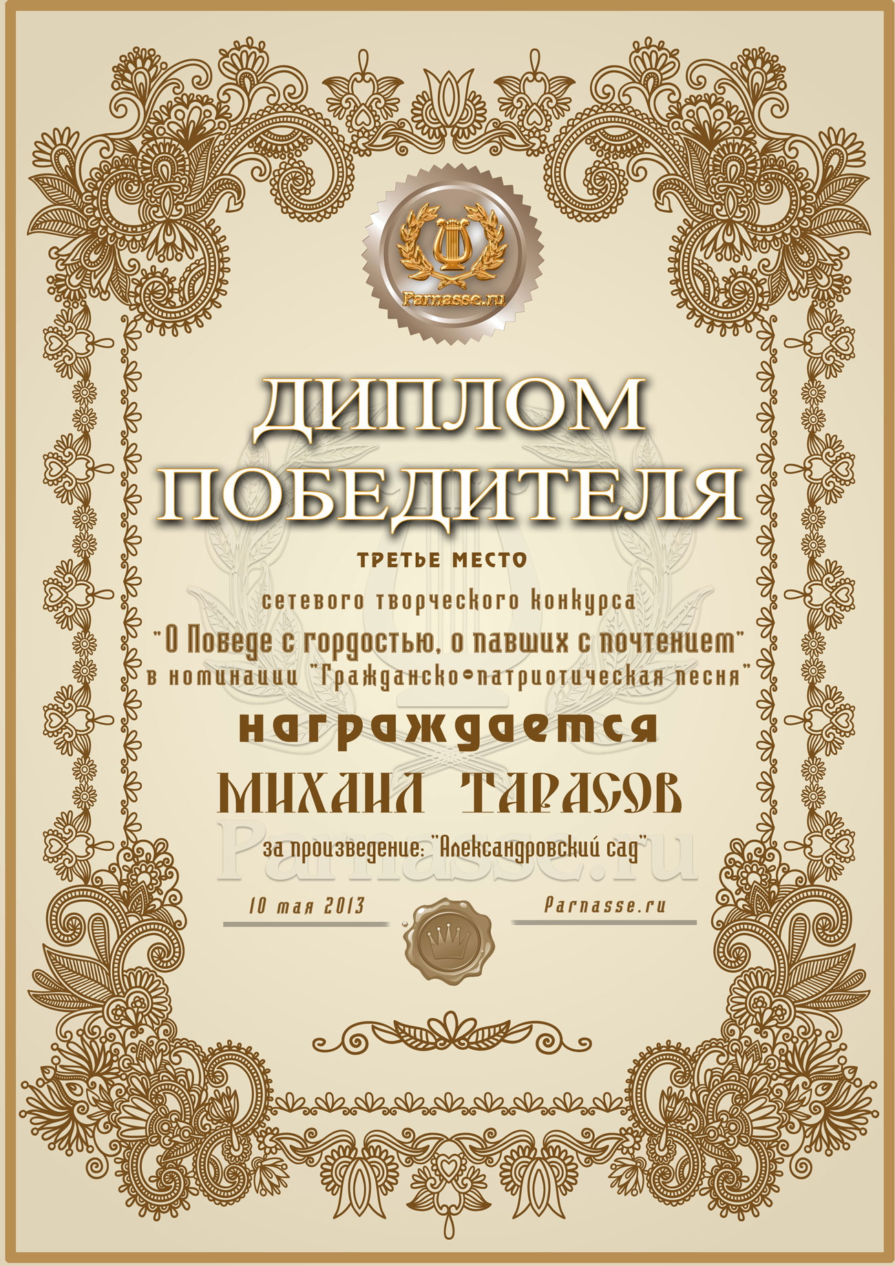 Третье место в музыкально-литературном конкурсе «О Победе с гордостью, о павших – с почтением!» Судейское голосование. Номинация «Песня гражданско-патриотической тематики»! Автору слов песни «АЛЕКСАНДРОВСКИЙ САД»! Поздравляем с красивой Победой в конкурсе!