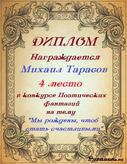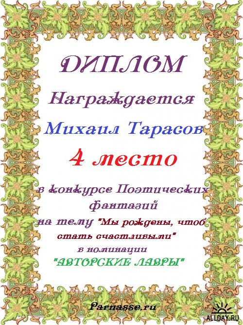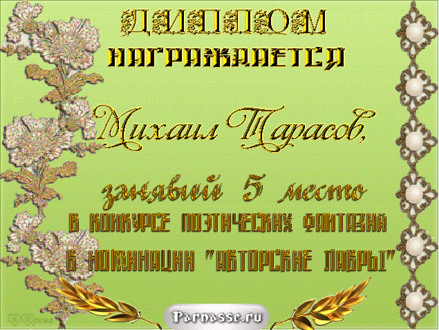 За неугасающую и неисчерпаемую творческую активность, постоянный контакт с Музой и признание сообществом "Парнасцев".От всей души желаем Вам, МИХАИЛ, здоровья, любви, успехов, благополучия, удачи и творческого вдохновения!