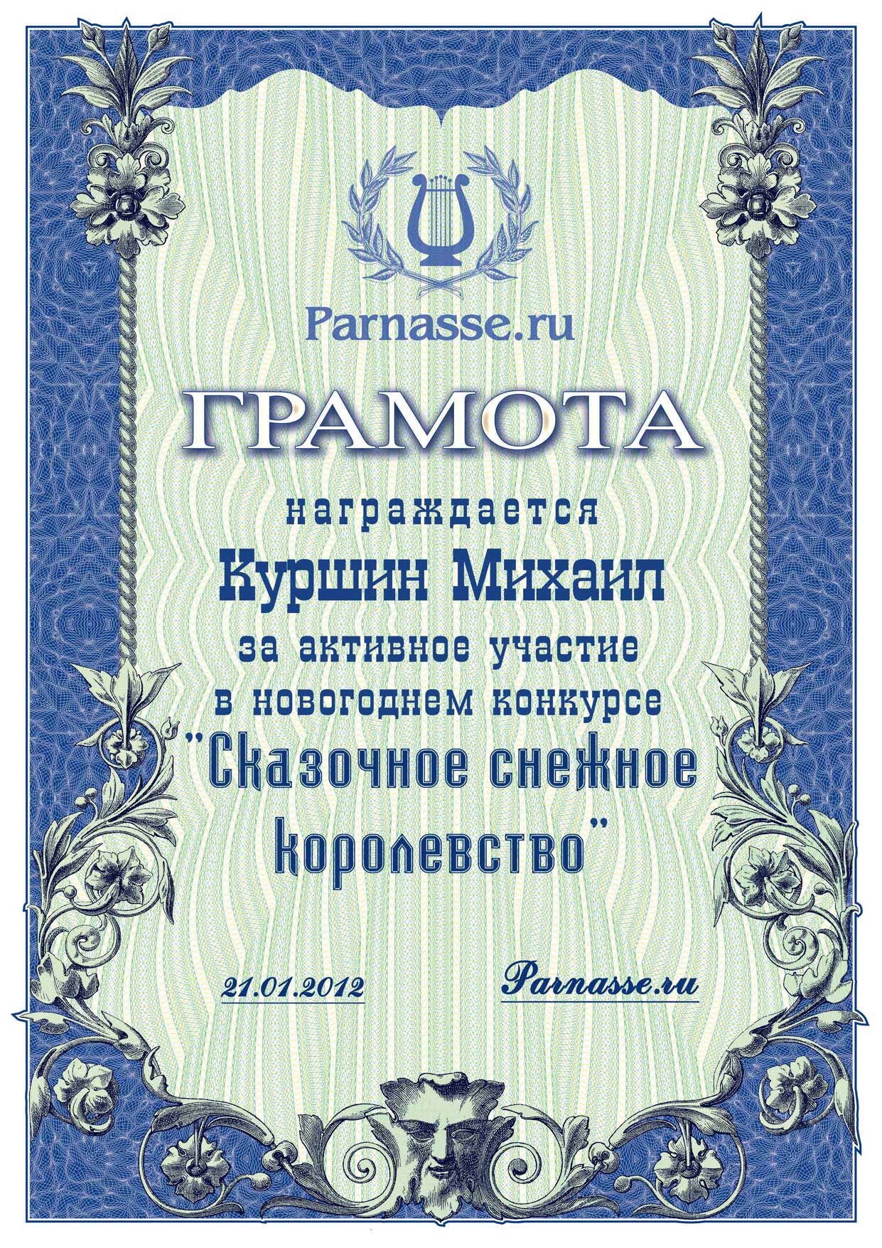 От лица Администрации творческого портала "Парнас" вручаем Вам этот памятный знак с самыми наилучшими пожеланиями! Пусть Вас весь год не покидает творческий запал, удача, а здоровье будет столь же крепким и нерушимым, как и традиция Новогоднего праздника! Счастья, успехов и любви Вам и Вашей семье, друзьям и близким!