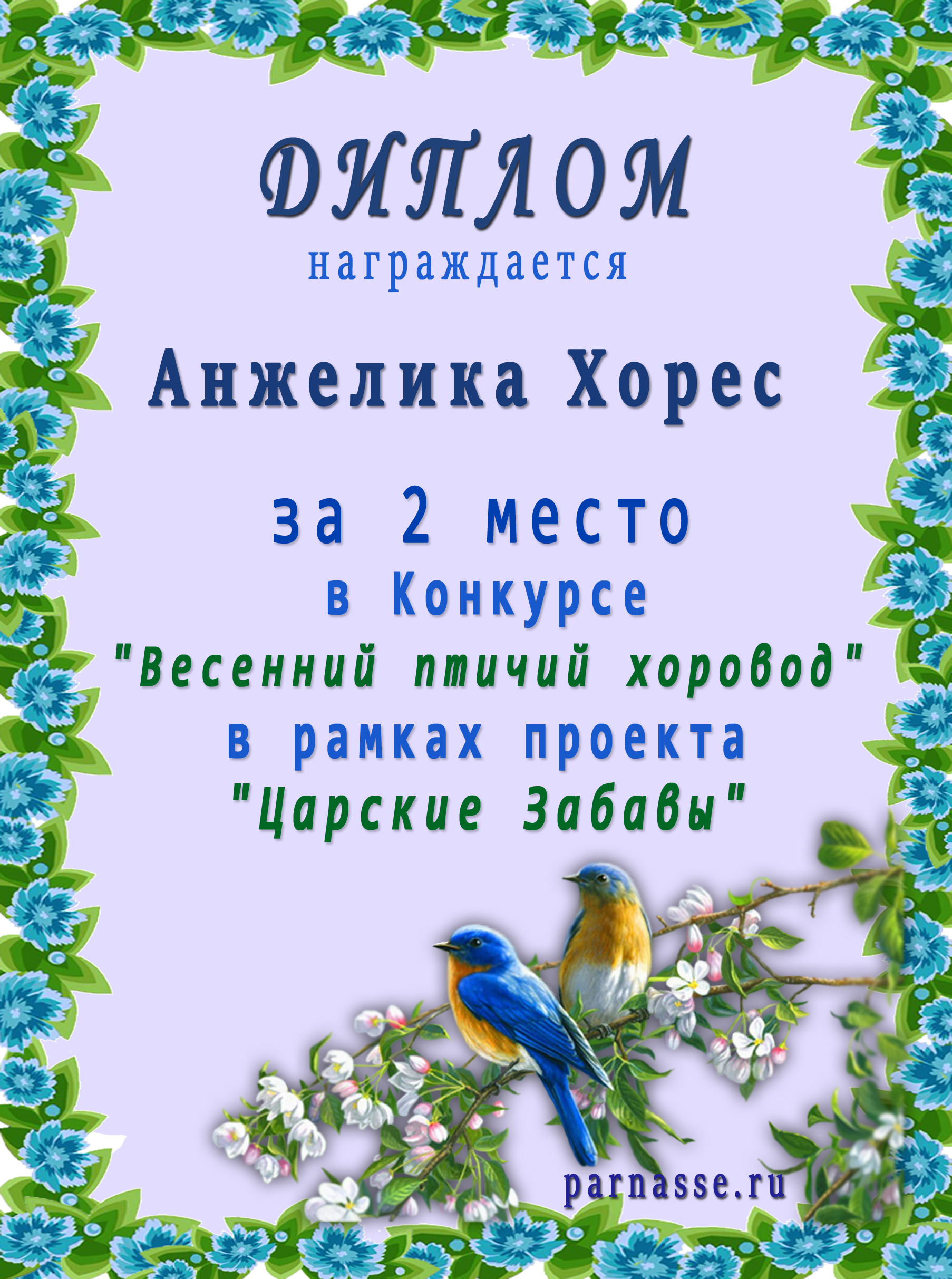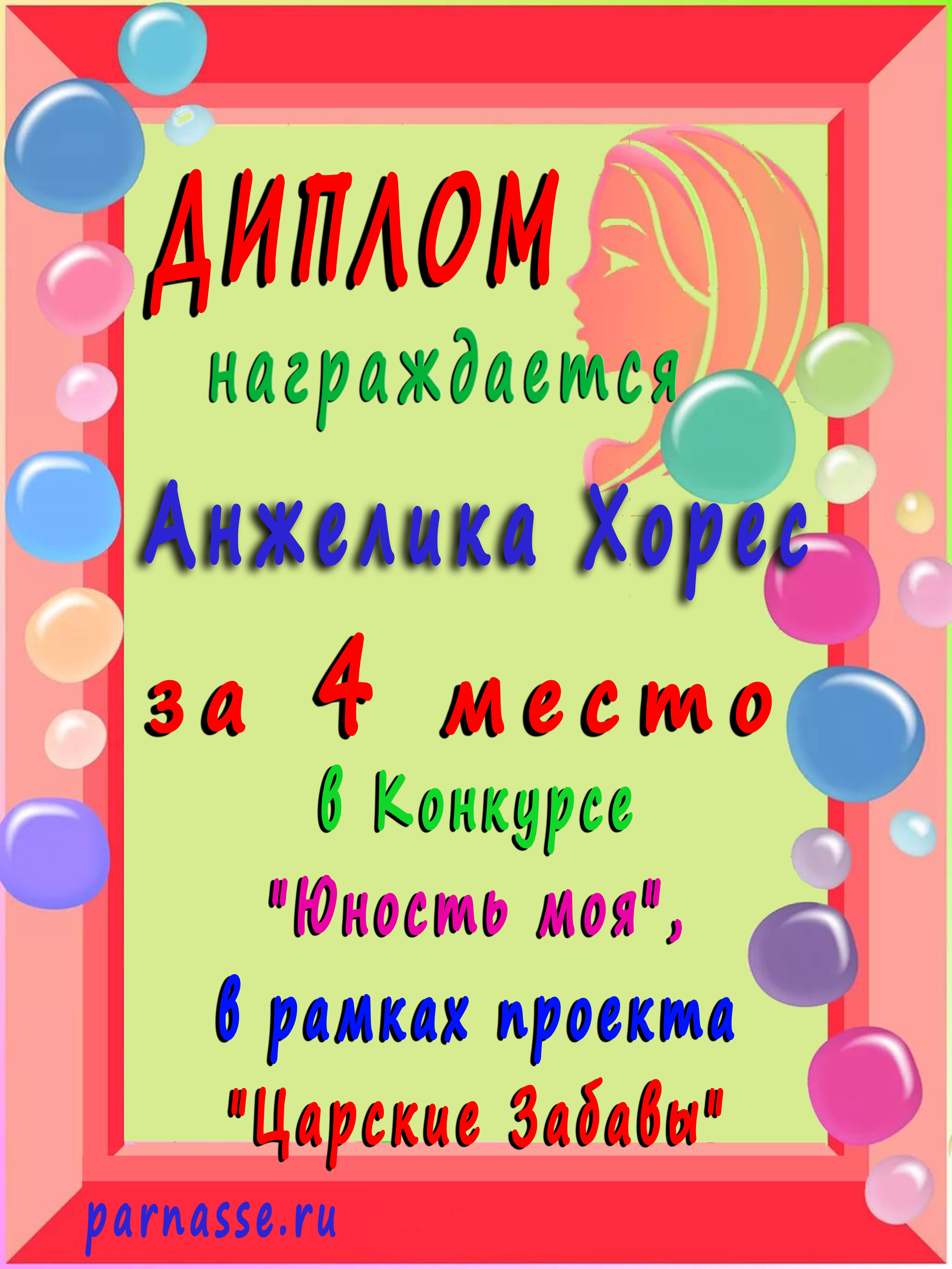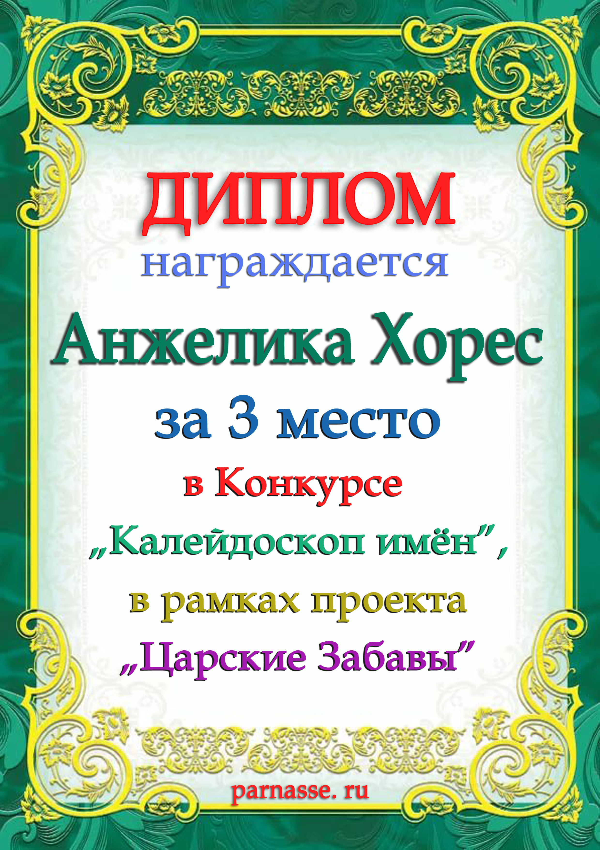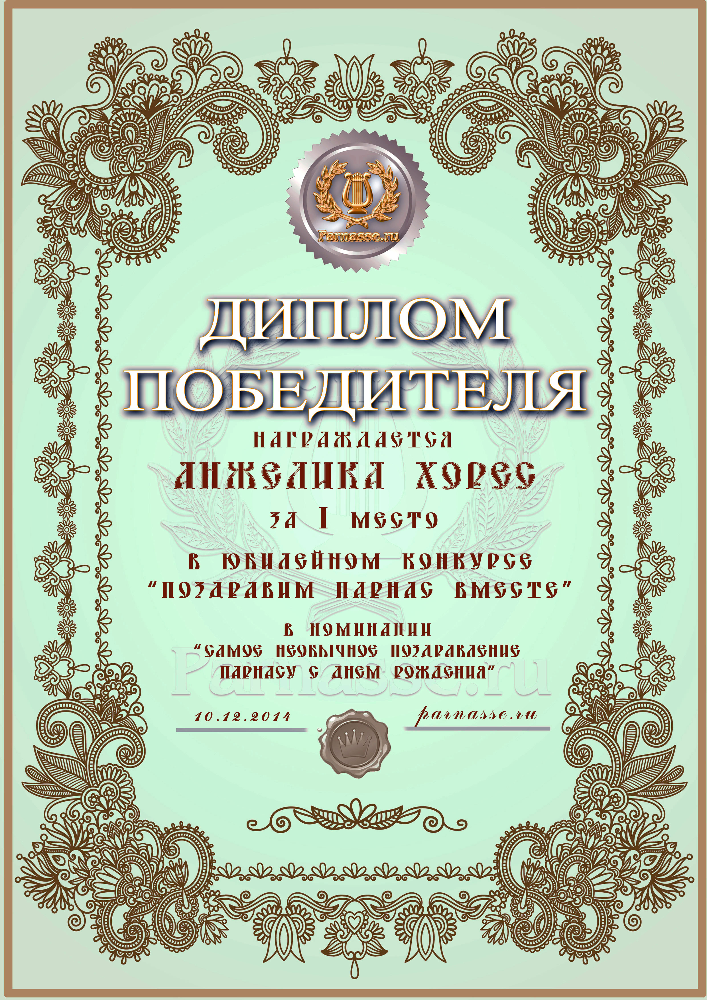 Диплом Победителя за 1 место в праздничном конкурсе "Поздравим Парнас с трёхлетием вместе!"