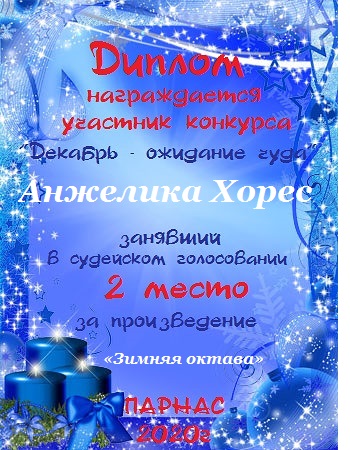 Диплом за 2 место в конкурсе "Литературный снегопад", поэзия, судейское голосование, произведение "Зимняя октава".