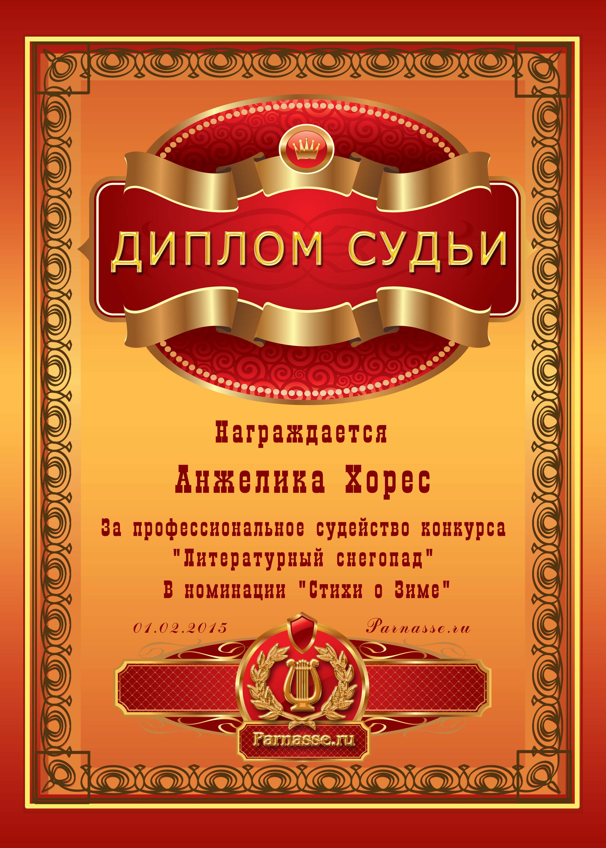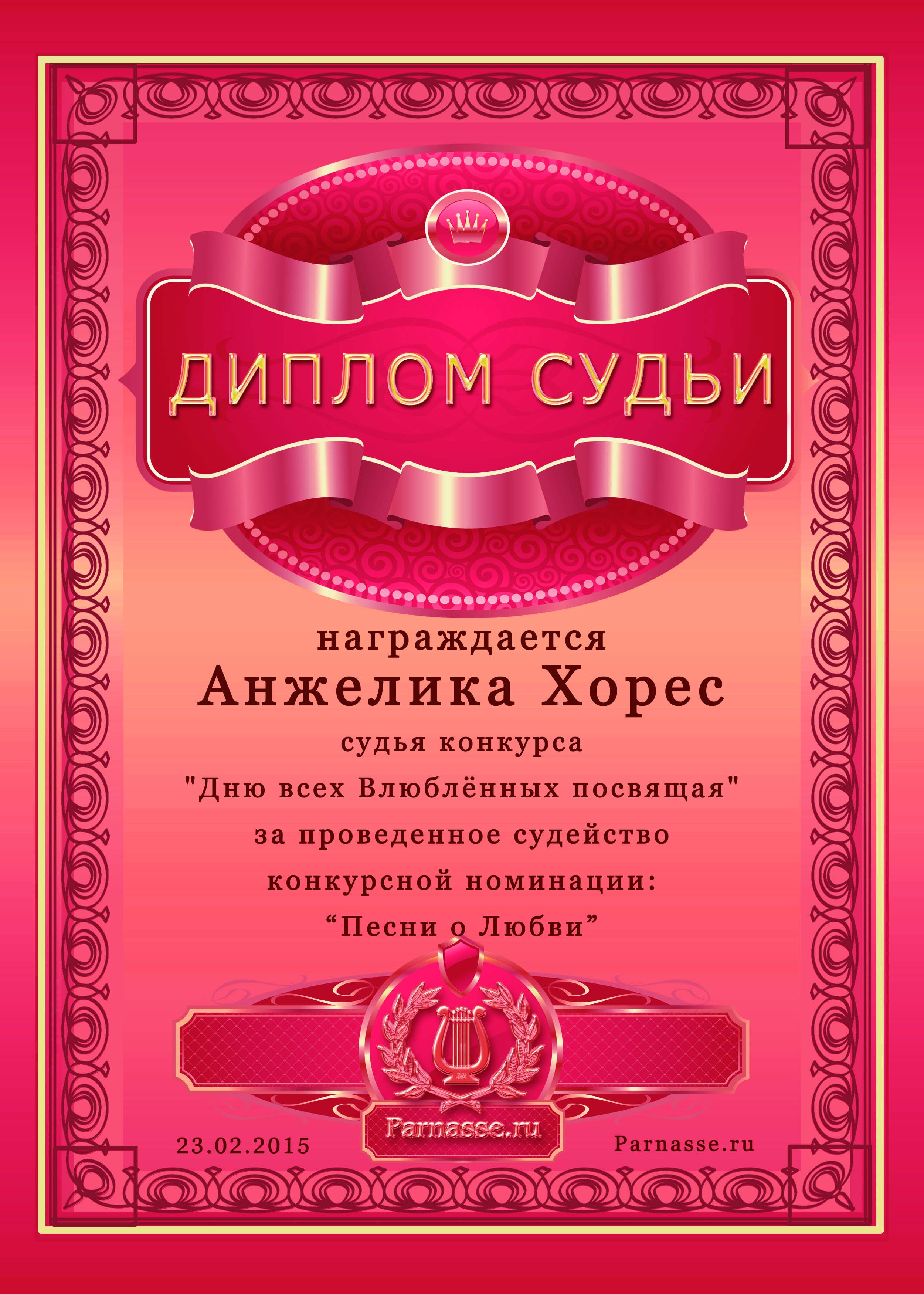 Диплом за профессиональное судейство конкурса "Дню всех Влюблённых посвящая".