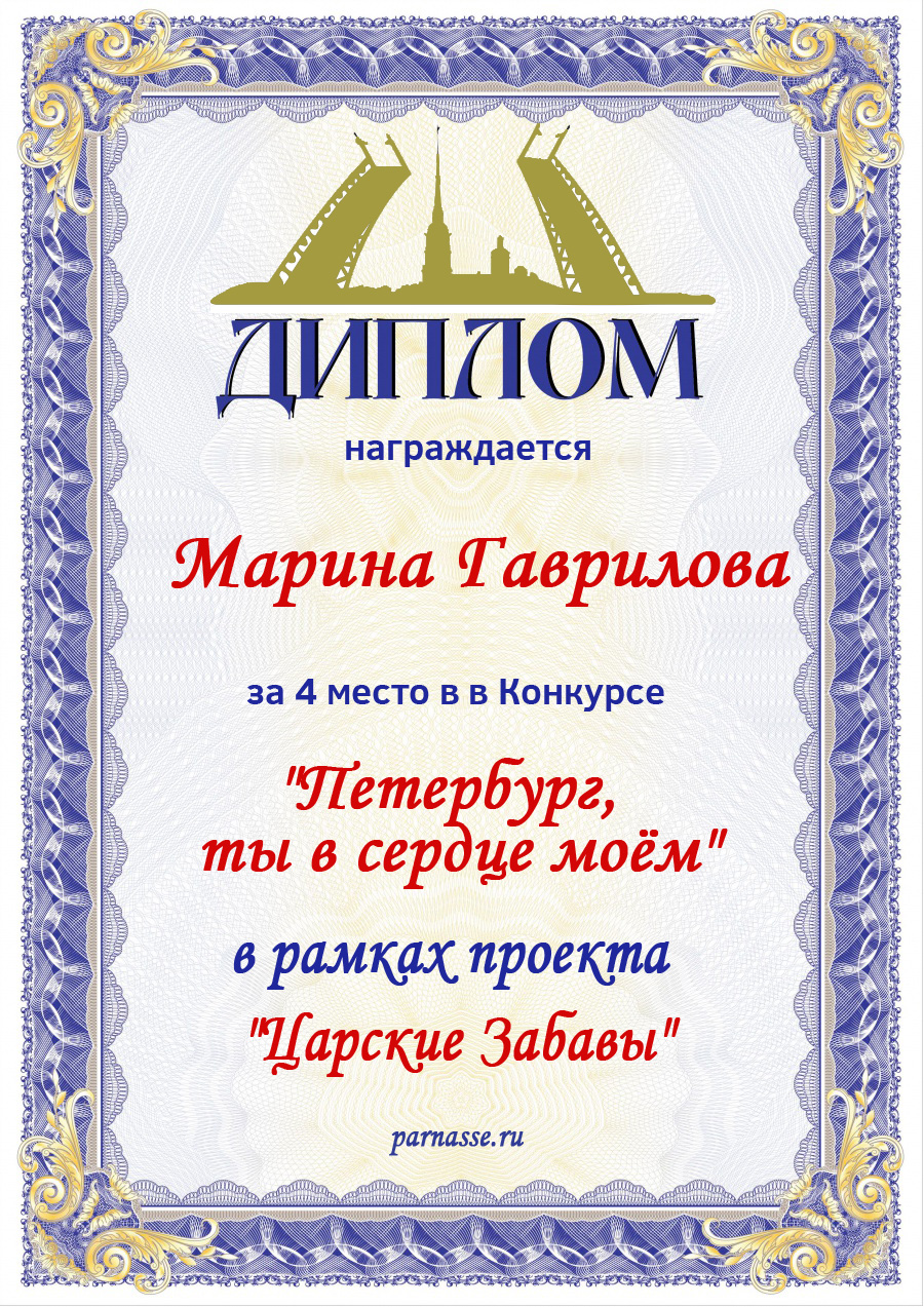 За 4 место в Конкурсе "Петербург, ты в сердце моём!" в рамках проекта "Царские Забавы"