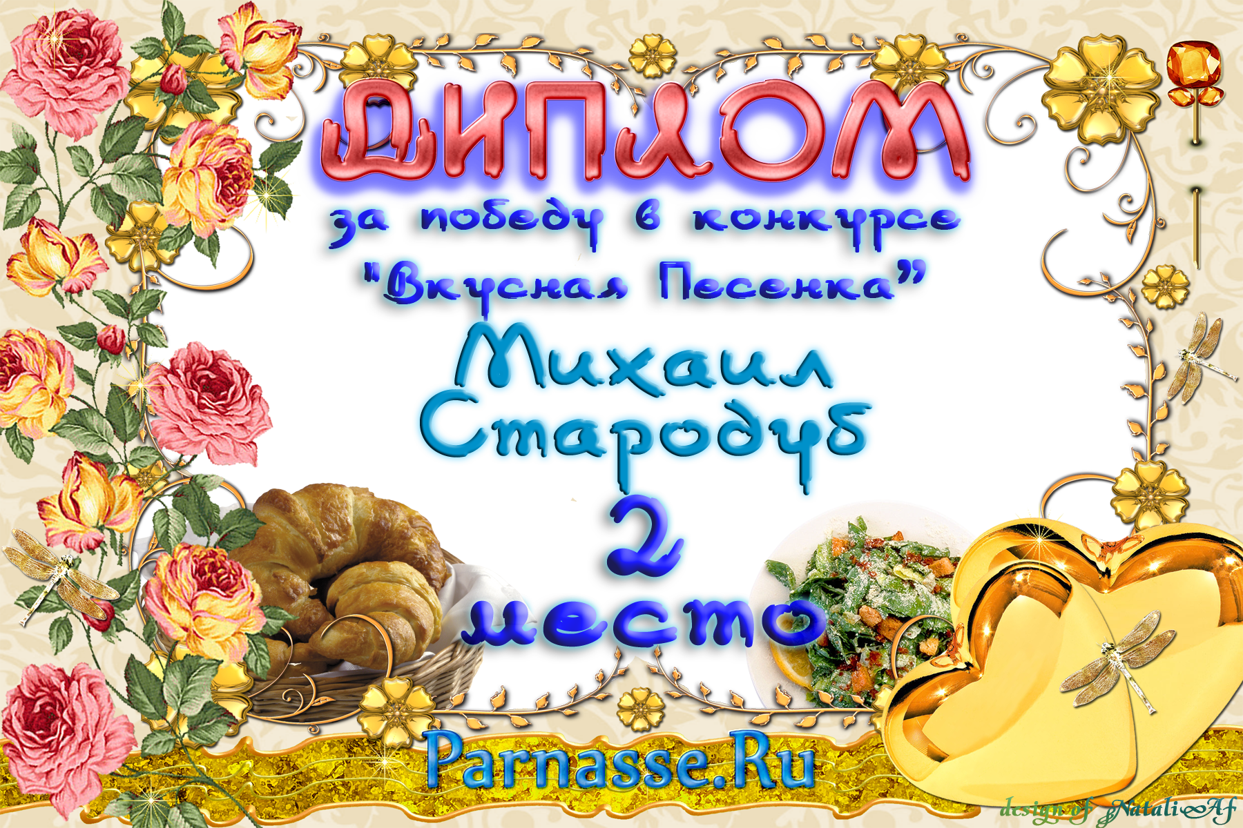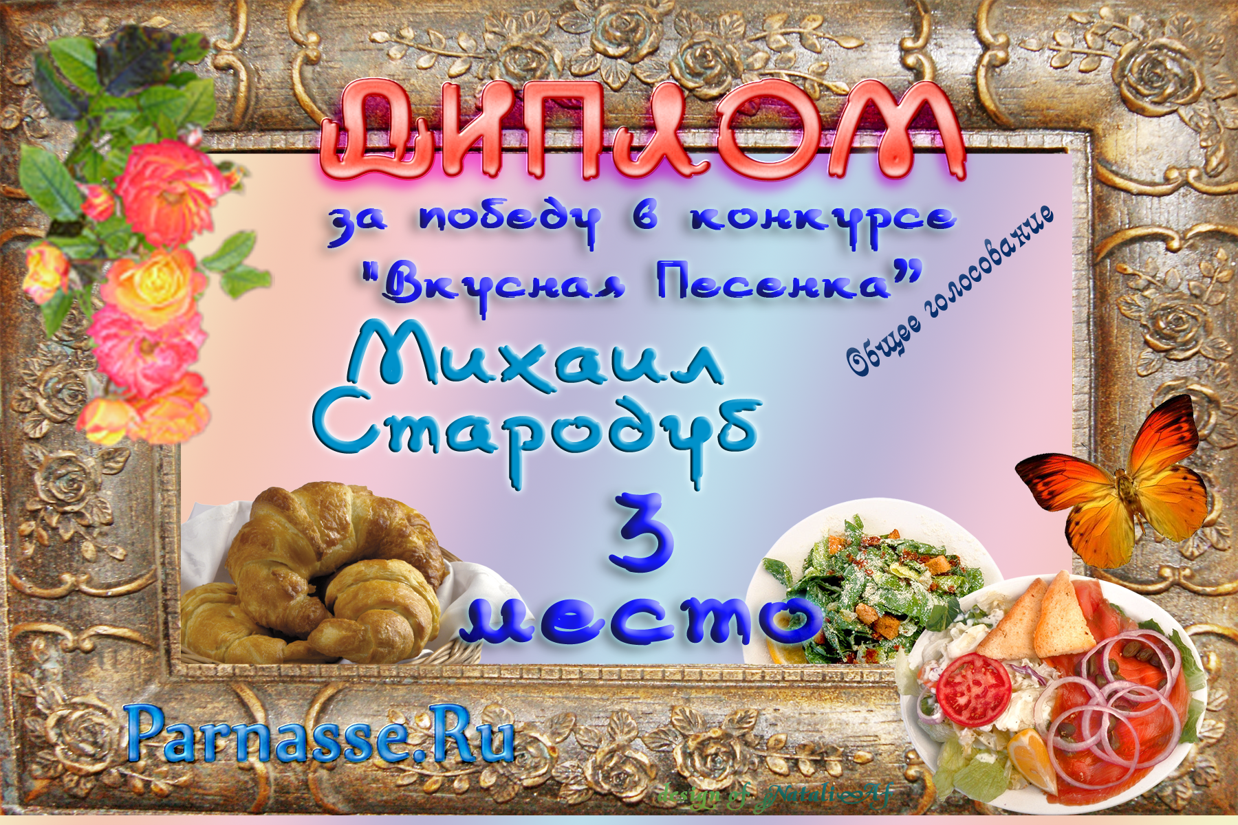 Уважаемый Михаил!От всего сердца поздравляем Вас с блестящей ПОБЕДОЙ в номинации «Вкусная ПЕСЕНКА», во "Вкусном конкурсе"
