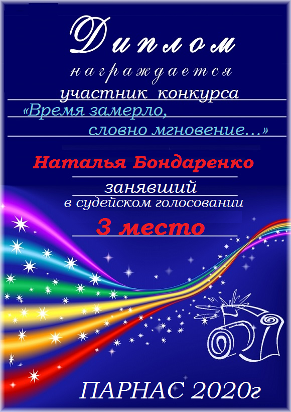 Третье место в конкурсе "Последнее послание зимы" в поэтической номинации, судейское голосование. Поздравляем с прекрасной Победой! Примите от нас искренние пожелания мира и добра, солнца, тепла и света! Улыбок друзей и заботы родных!
