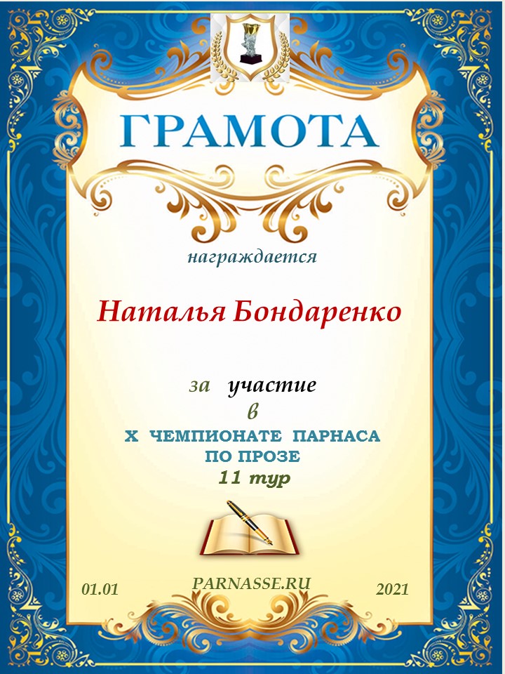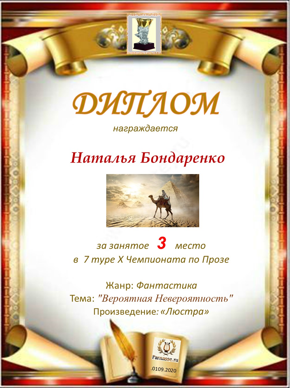 Вручается за 3 место в конкурсе "X Чемпионат Парнаса по Прозе" - 7 тур