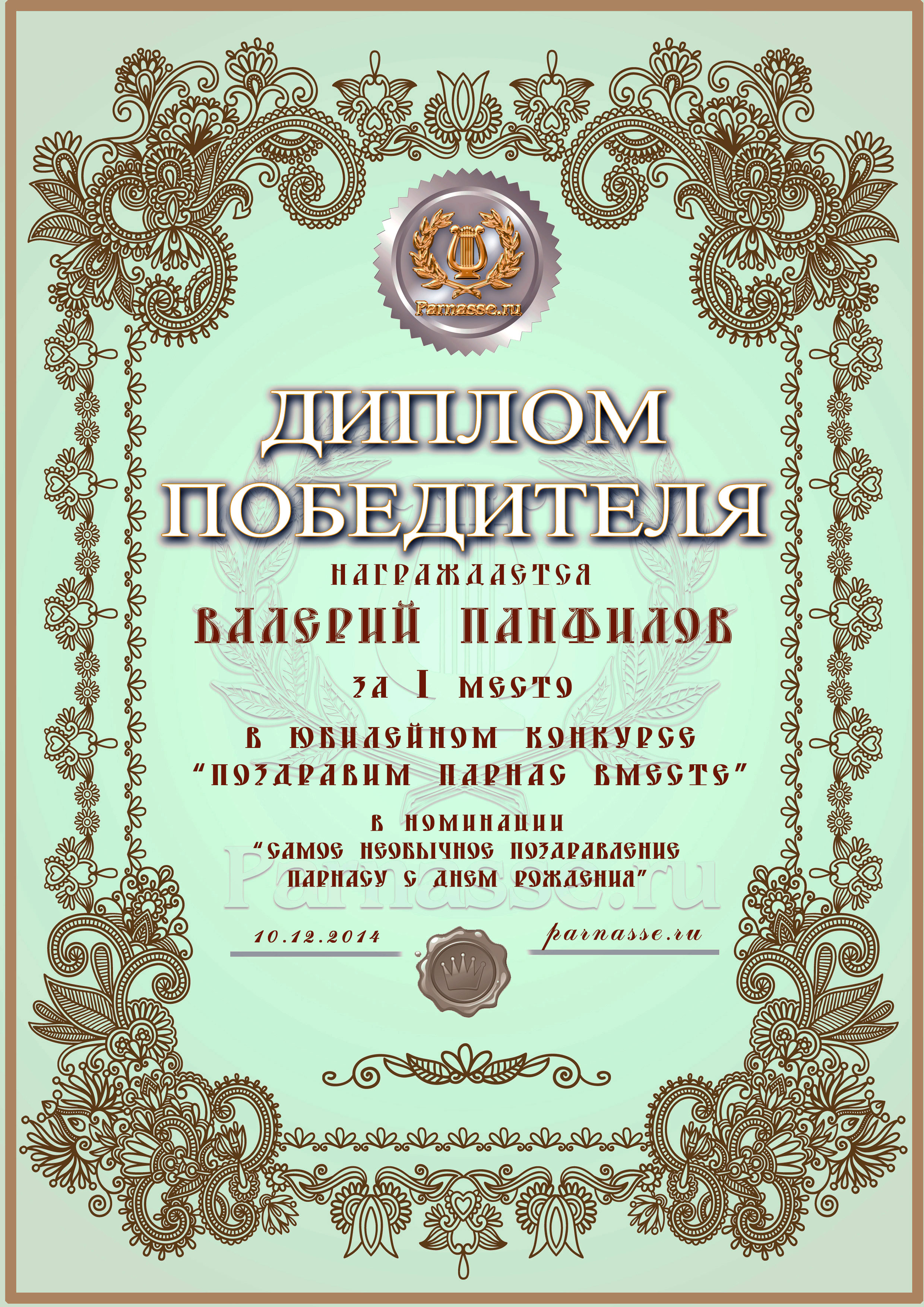 Первое место в праздничном конкурсе "Поздравим Парнас вместе!", в номинации "Самое необычное поздравление Парнаса с Днём Рождения". Сердечно благодарим Вас за великолепные оригинальные поздравления и прекрасные пожелания нашему Парнасу! Мы рады, что Вы с нами, и желаем, чтобы Ваше творчество и впредь радовало нас своей красотой, легкостью, образностью и глубочайшим эмоциональным смыслом! Пусть удача всегда сопутствует Вам во всех начинаниях, а здоровье никогда не подводит, будьте всегда на пике творческой активности и мы с Вами встретим еще не одну годовщину сайта! Будьте счастливы и всегда готовы к новым свершениям на благо искусства! Произведение "Акростих Парнасу"