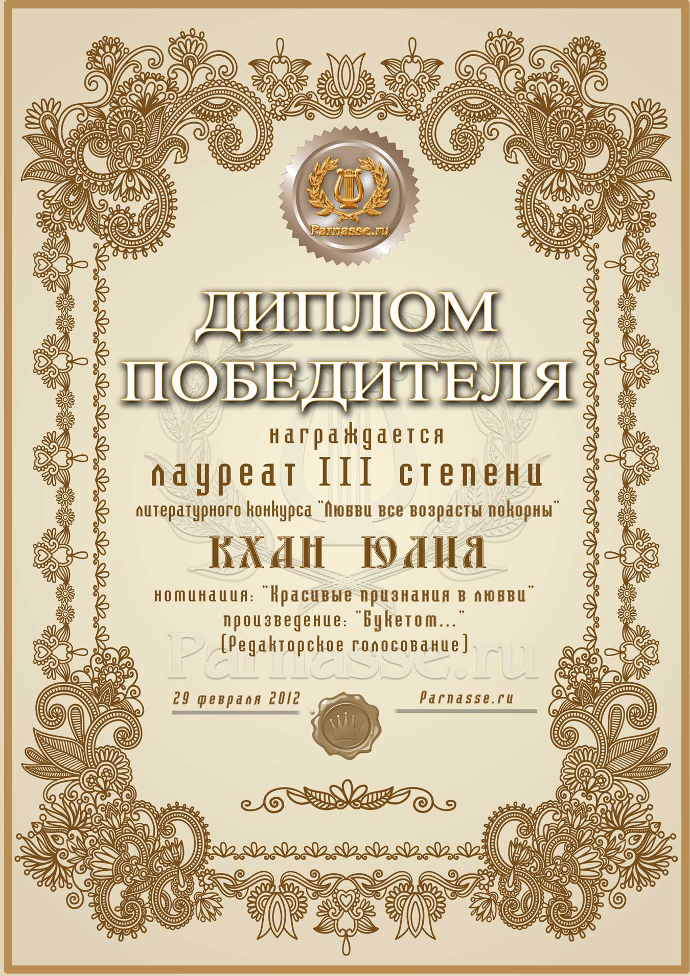 ![]() ![]() Лауреат III степени литературного конкурса «Любви все возрасты покорны»!