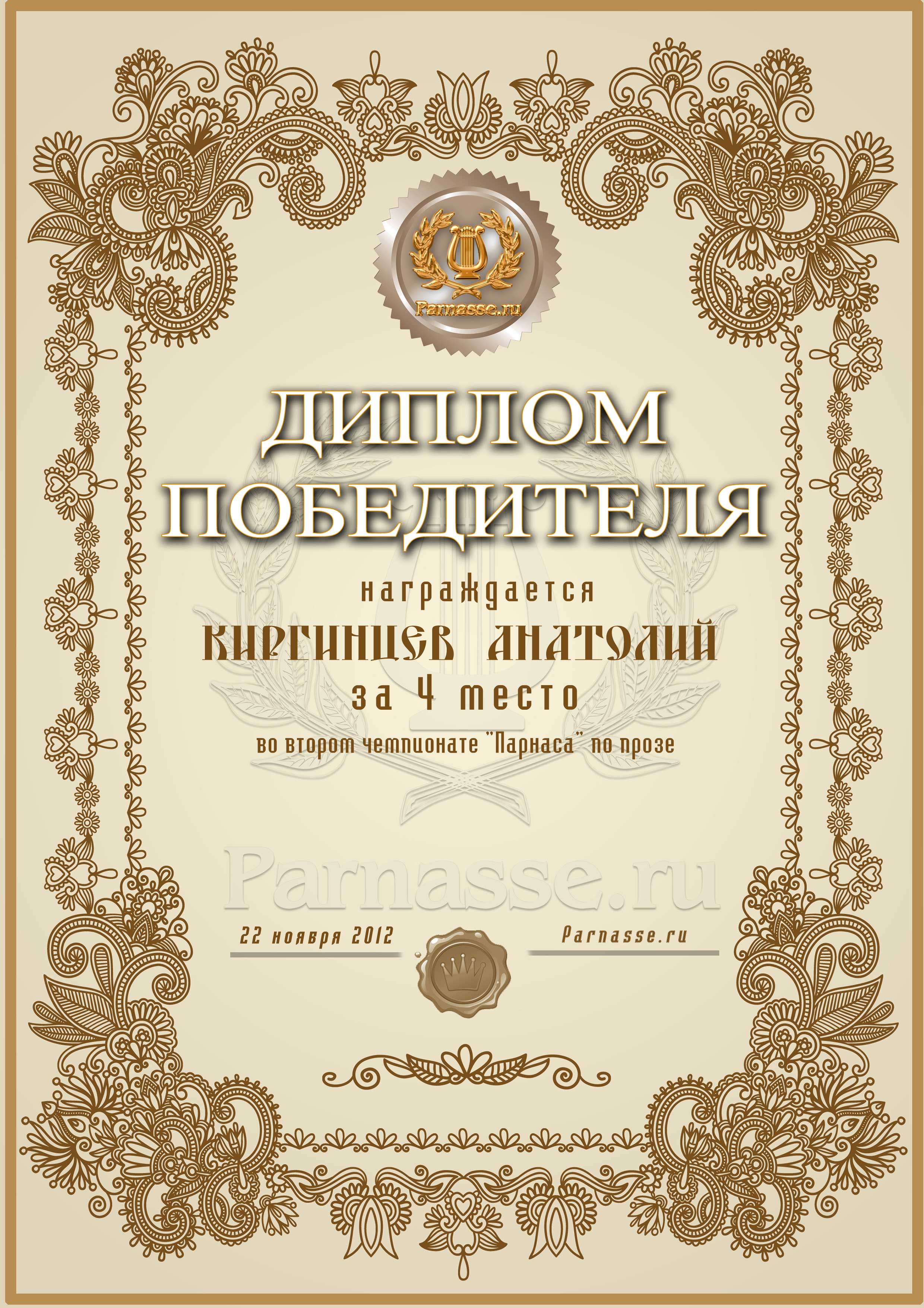 За четвертое место во втором Чемпионате Парнаса по прозе! Поздравляем! Спасибо за активное участие на Чемпионате!