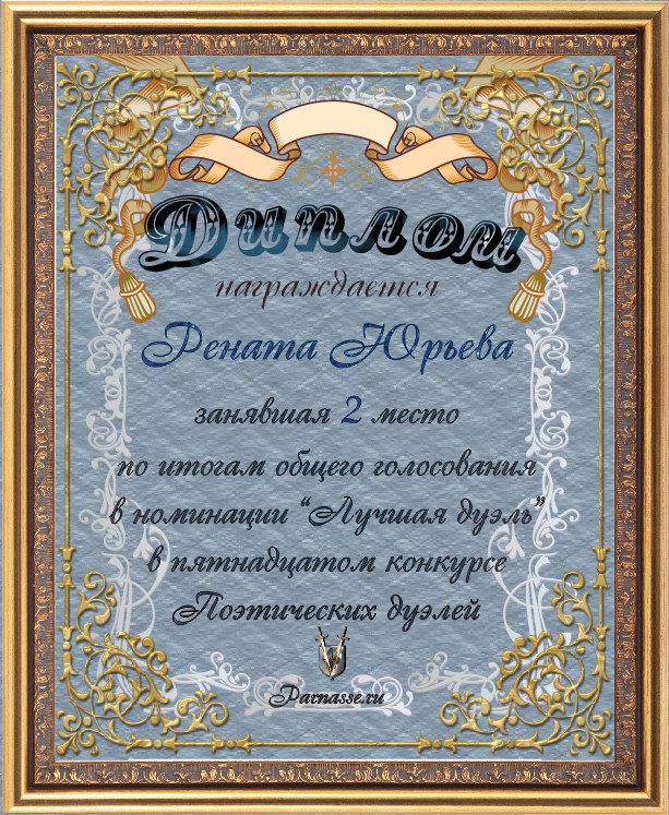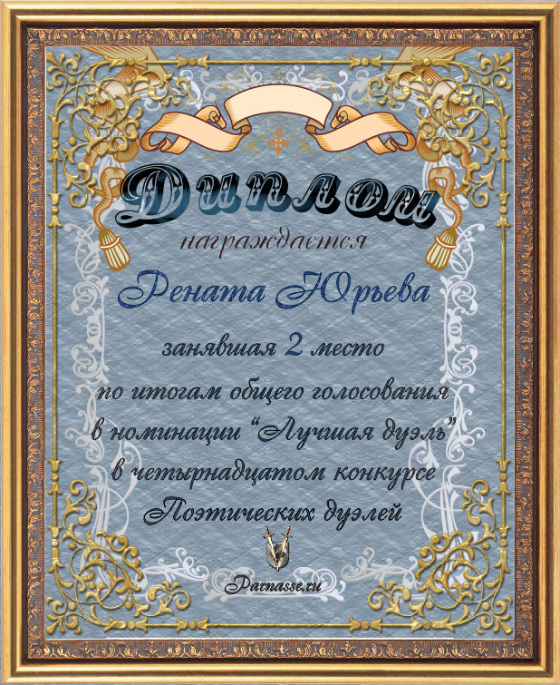 Диплом за 2-е место в номинации "ЛУЧШАЯ ДУЭЛЬ" по итогам общего голосования в 14ом конкурсе поэтических дуэлей (№ 15.1)