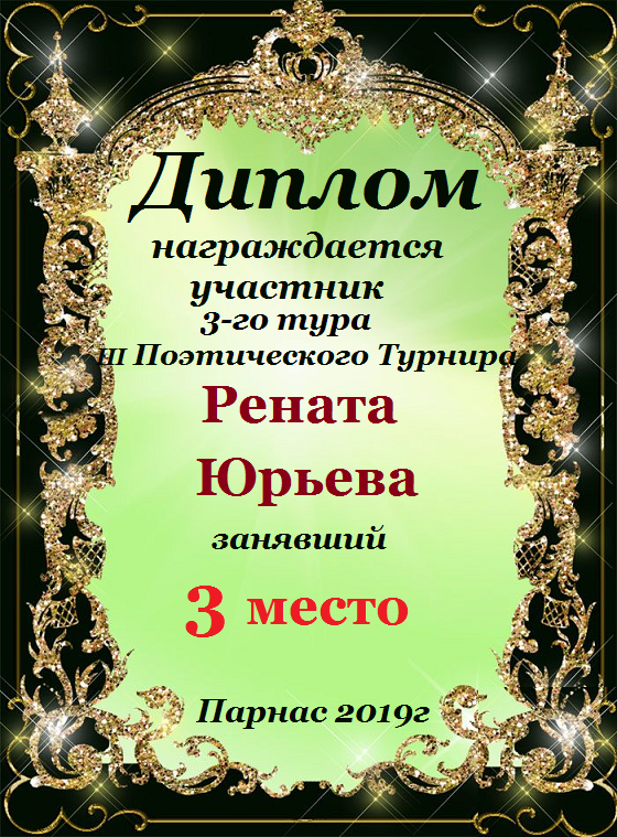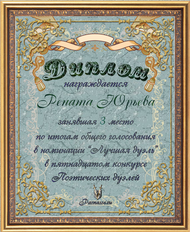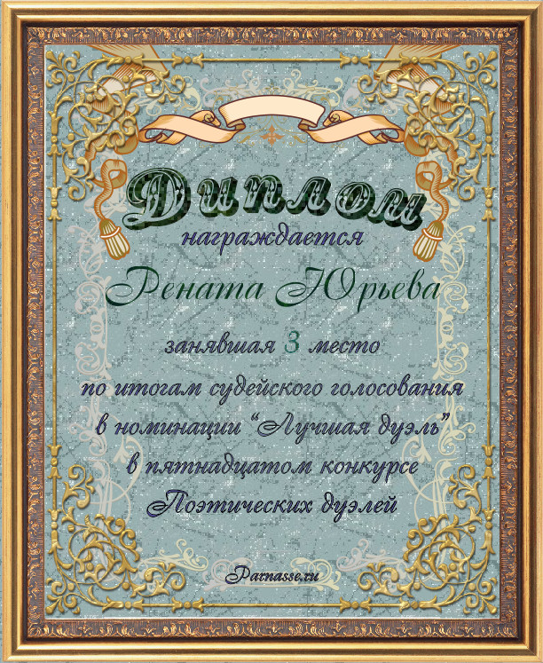 Диплом за 3-е место в номинации "ЛУЧШАЯ ДУЭЛЬ" по итогам судейского голосования в 15ом конкурсе поэтических дуэлей (№ 8.2)