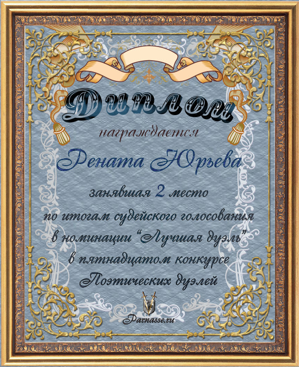 Диплом за 2-е место в номинации "ЛУЧШАЯ ДУЭЛЬ" по итогам судейского голосования в 15ом конкурсе поэтических дуэлей (№ 14.1)