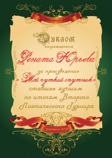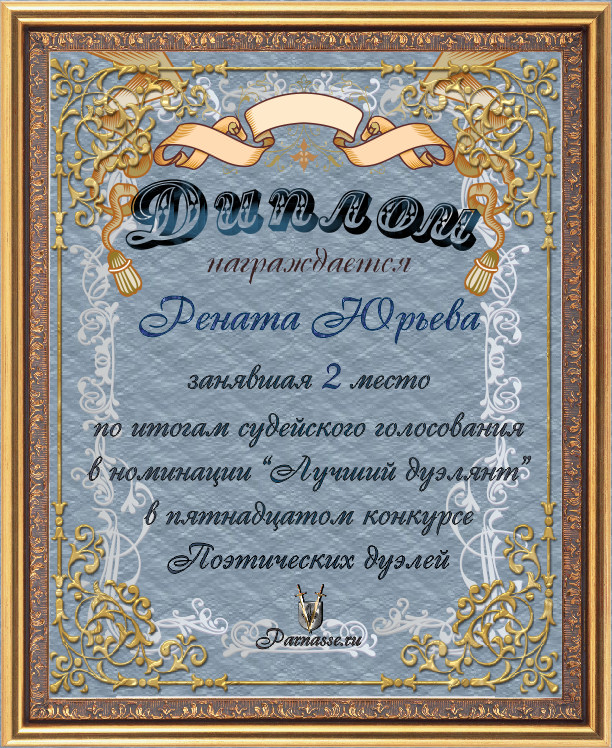 Диплом за 2-е место в номинации "ЛУЧШИЙ ДУЭЛЯНТ" по итогам судейского голосования в 15ом конкурсе поэтических дуэлей