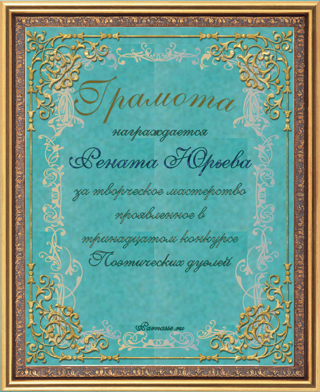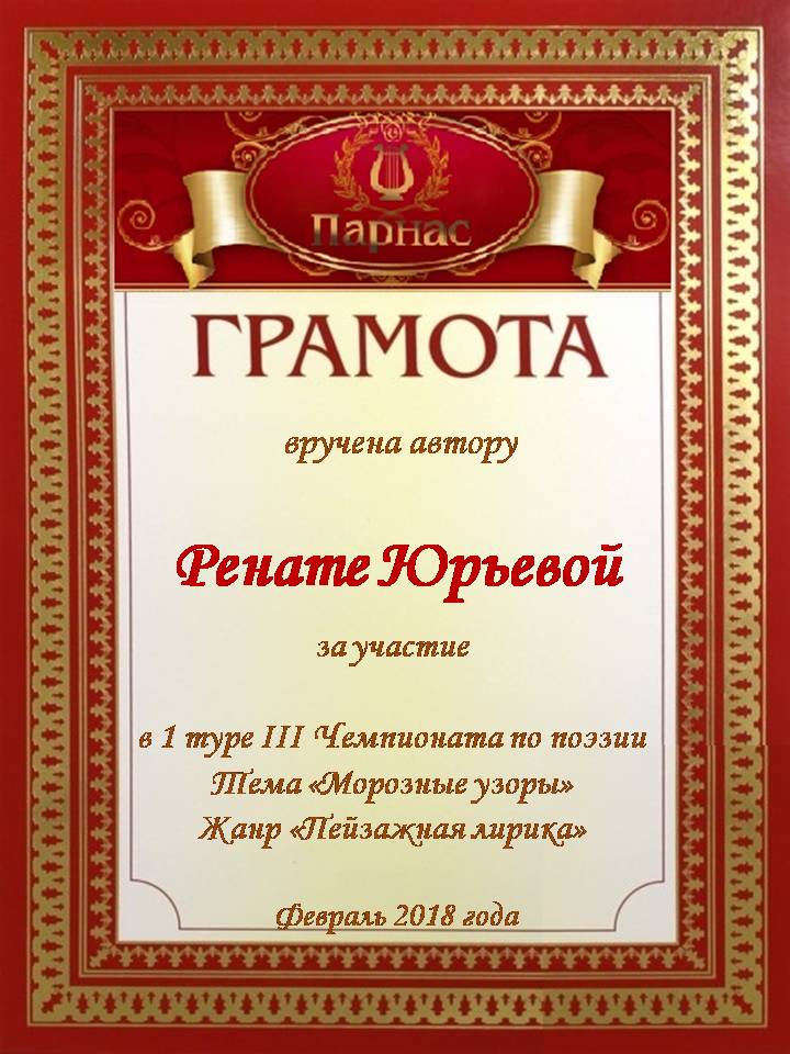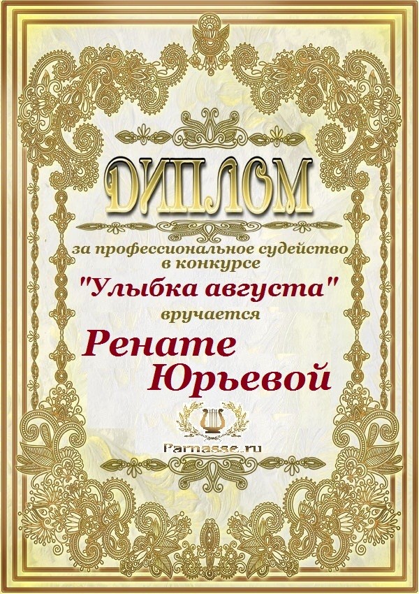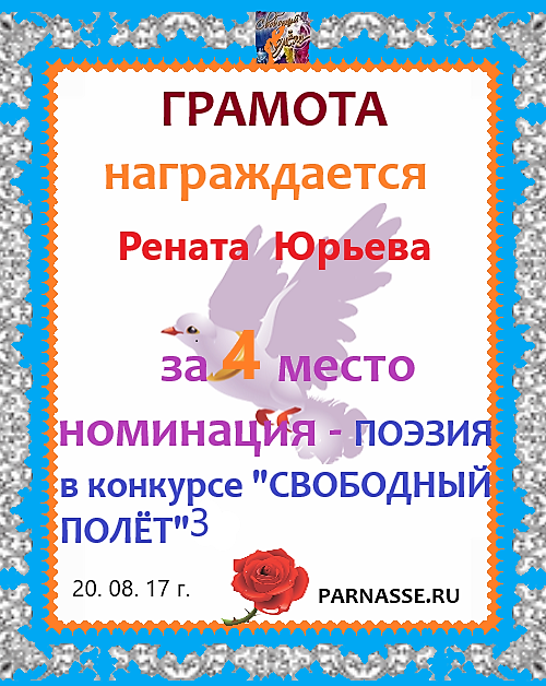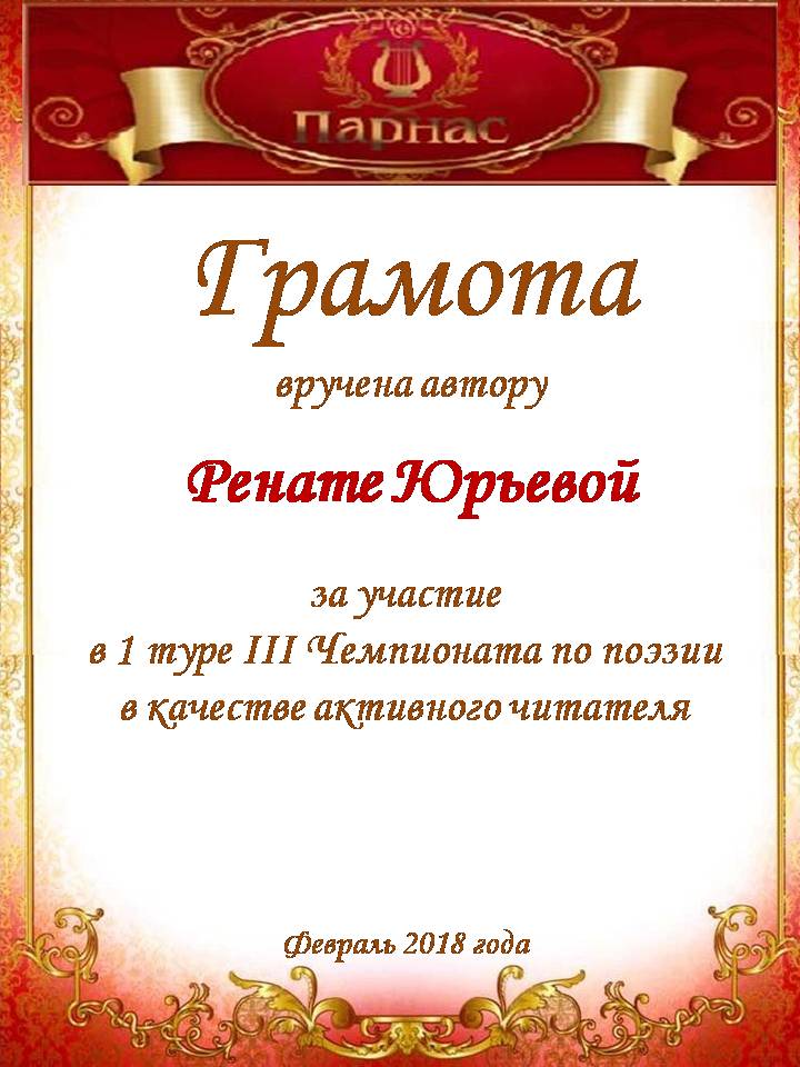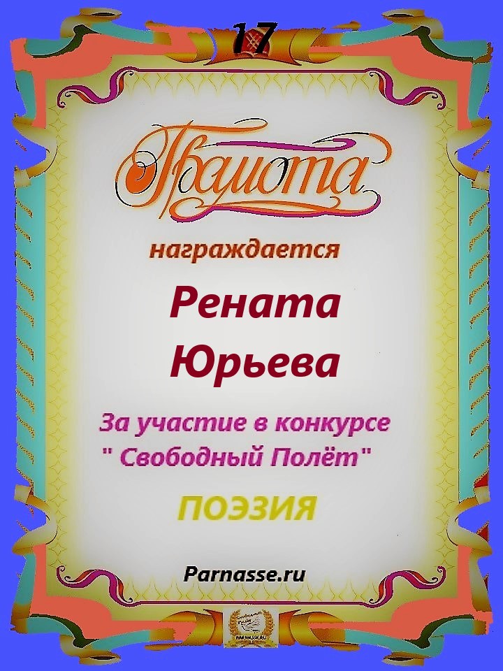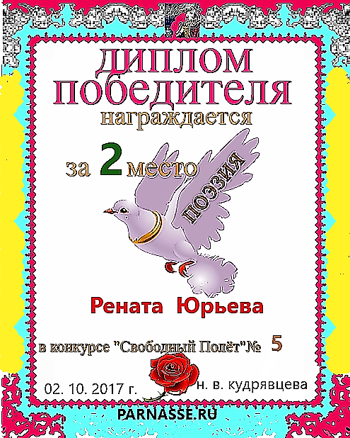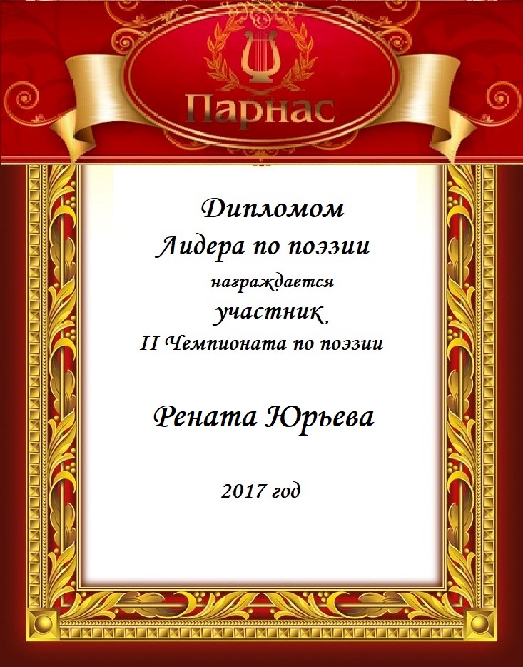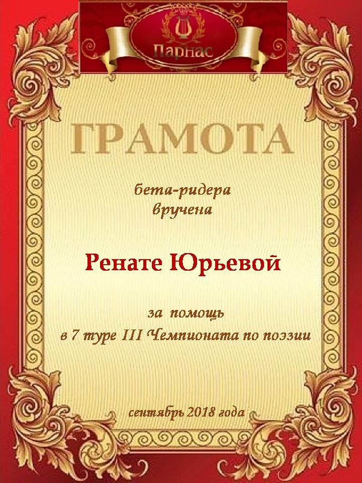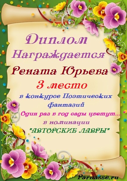 За неугасающую и неисчерпаемую творческую активность, постоянный контакт с Музой и признание сообществом "Парнасцев".От всей души желаем Вам, Рената, здоровья, любви, успехов, благополучия, удачи и творческого вдохновения!