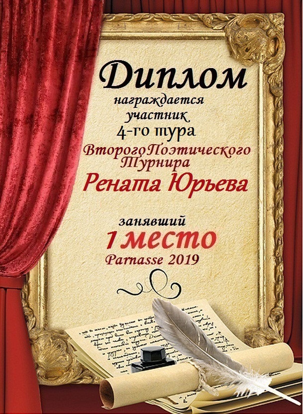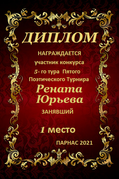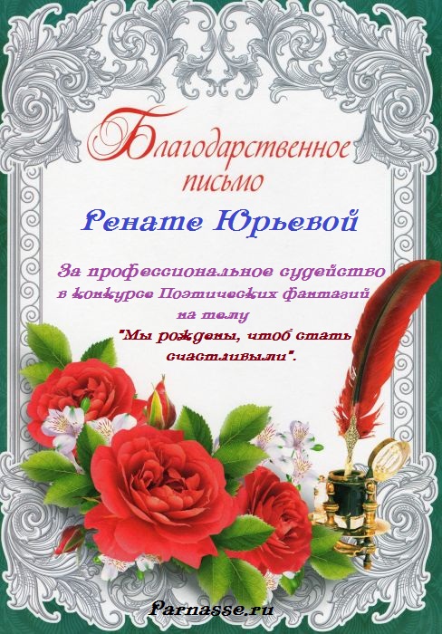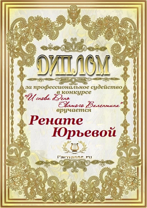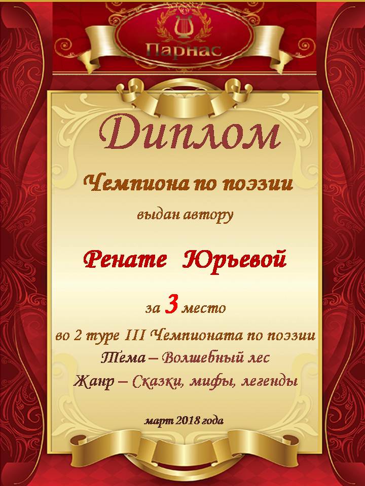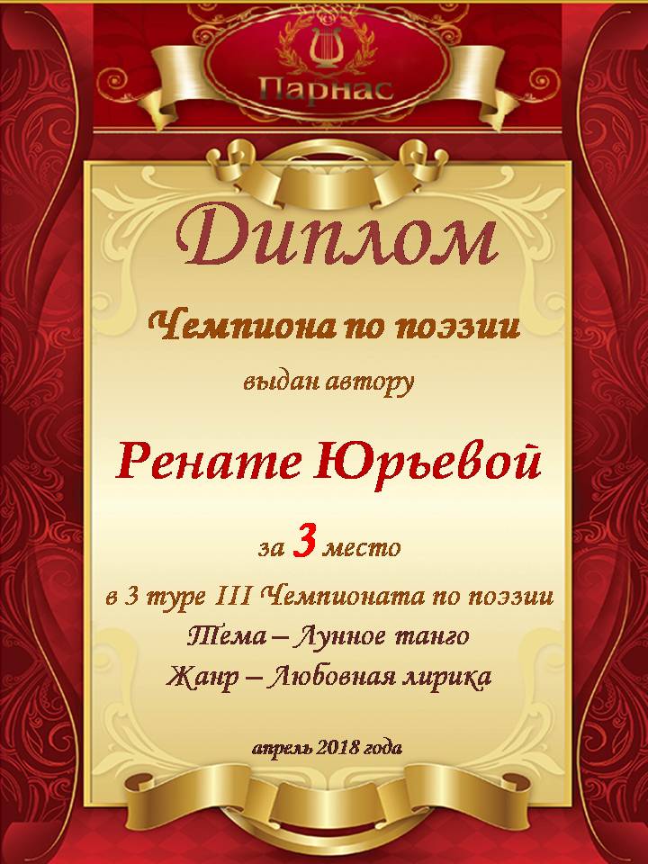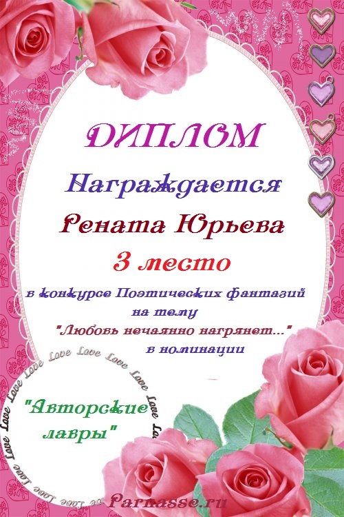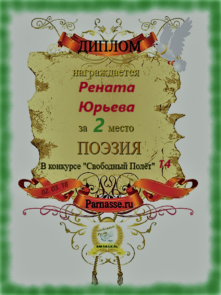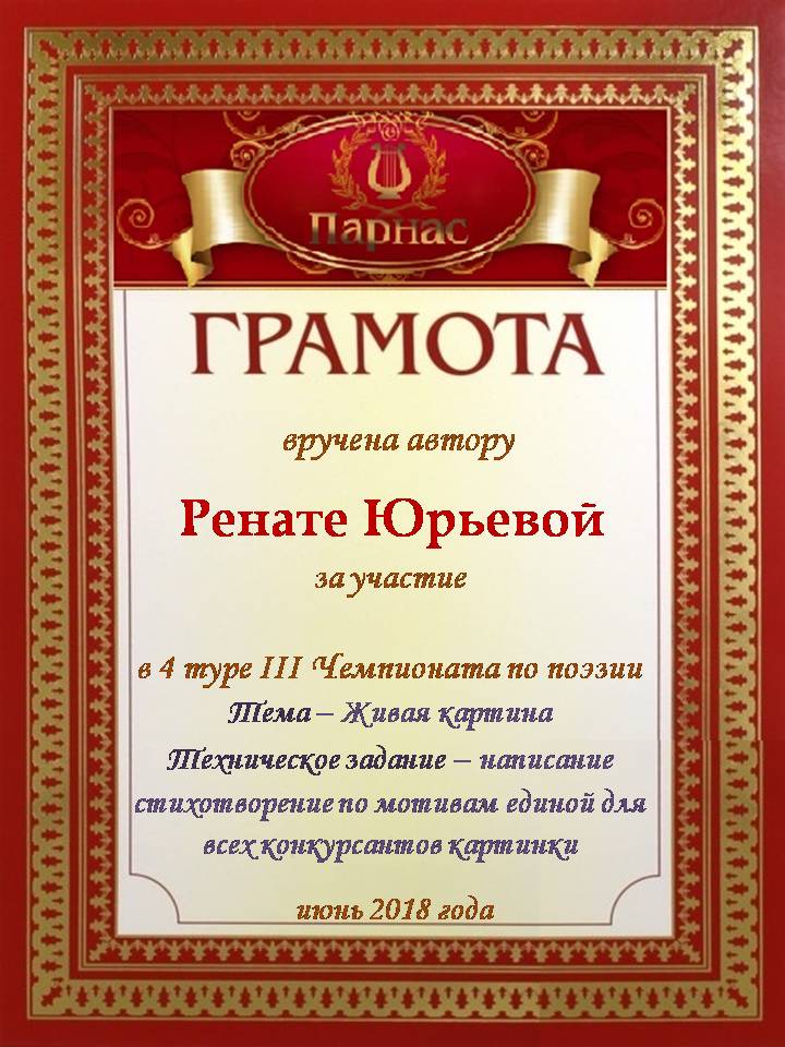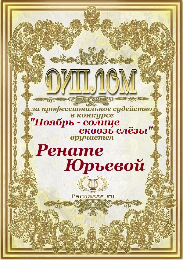 За неугасающую и неисчерпаемую творческую активность, постоянный контакт с Музой и признание сообществом "Парнасцев".От всей души желаем Вам, Рената, здоровья, любви, успехов, благополучия, удачи и творческого вдохновения!