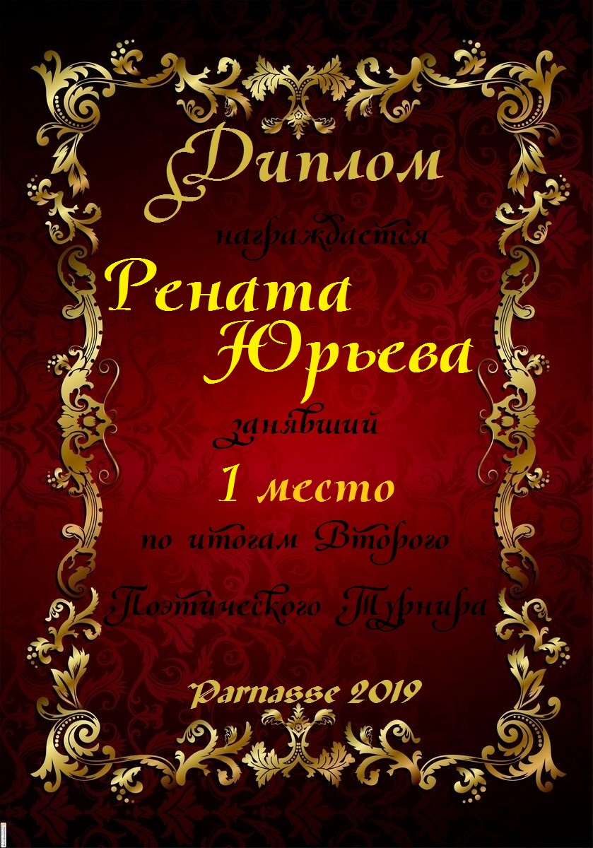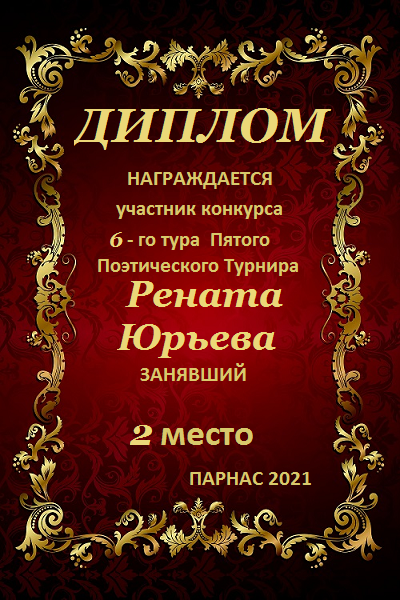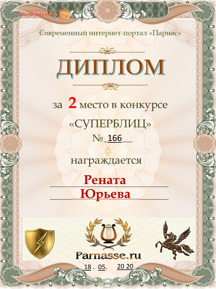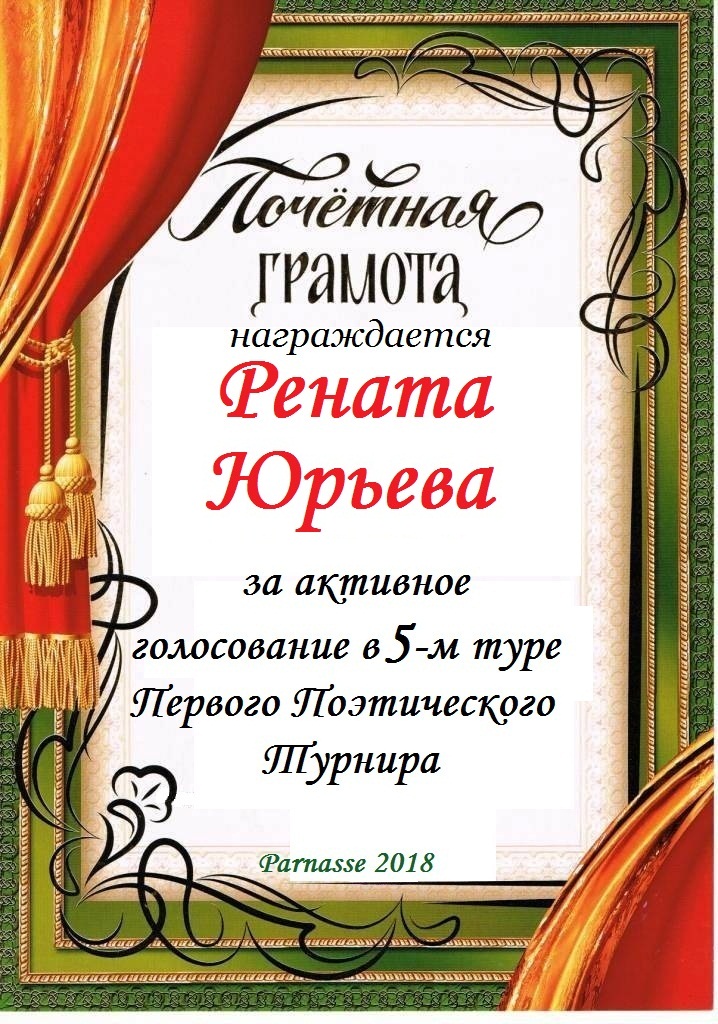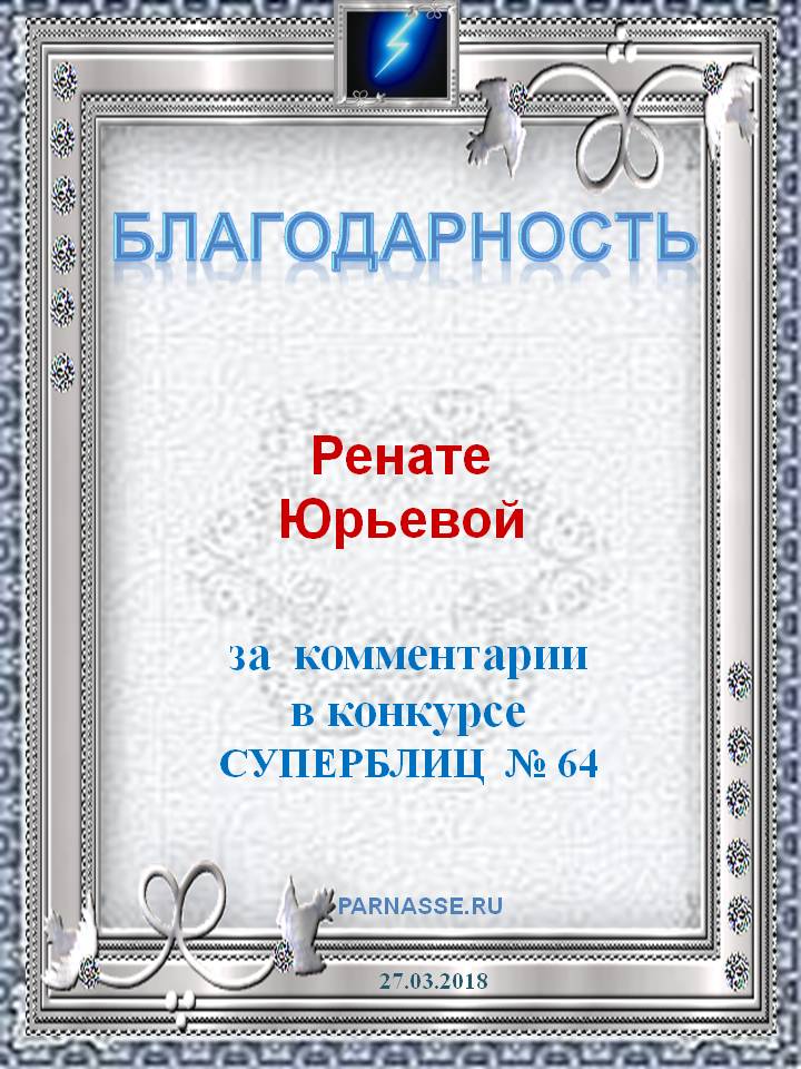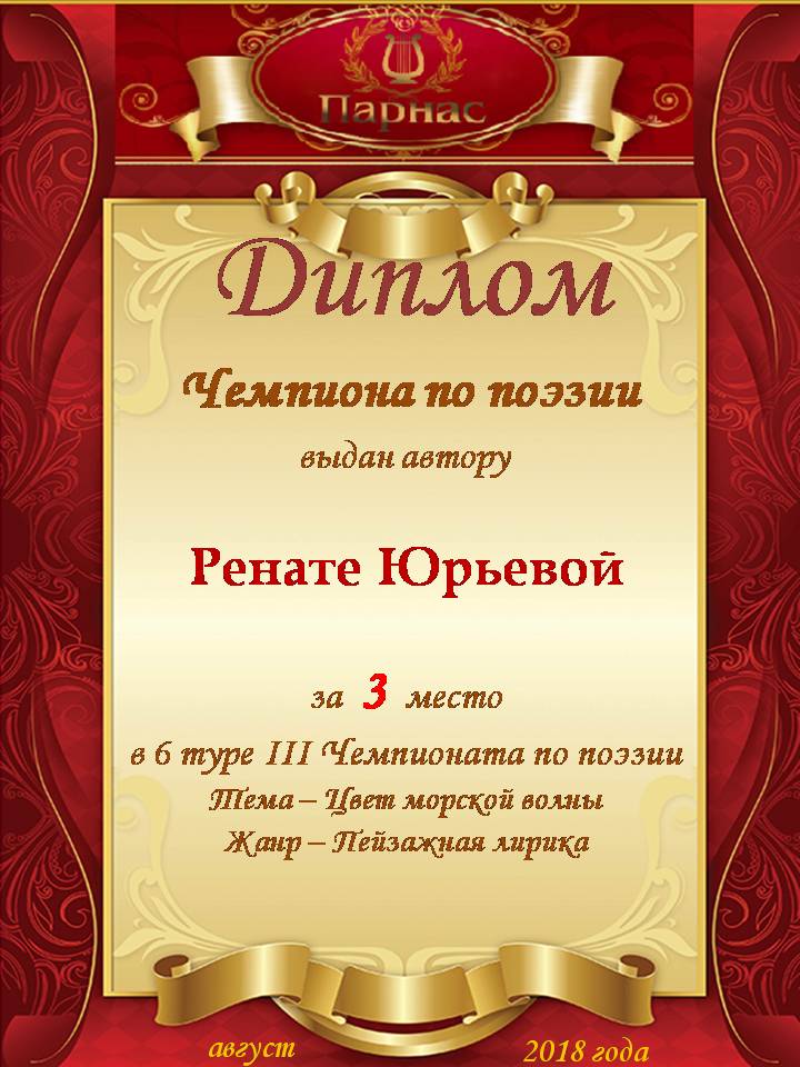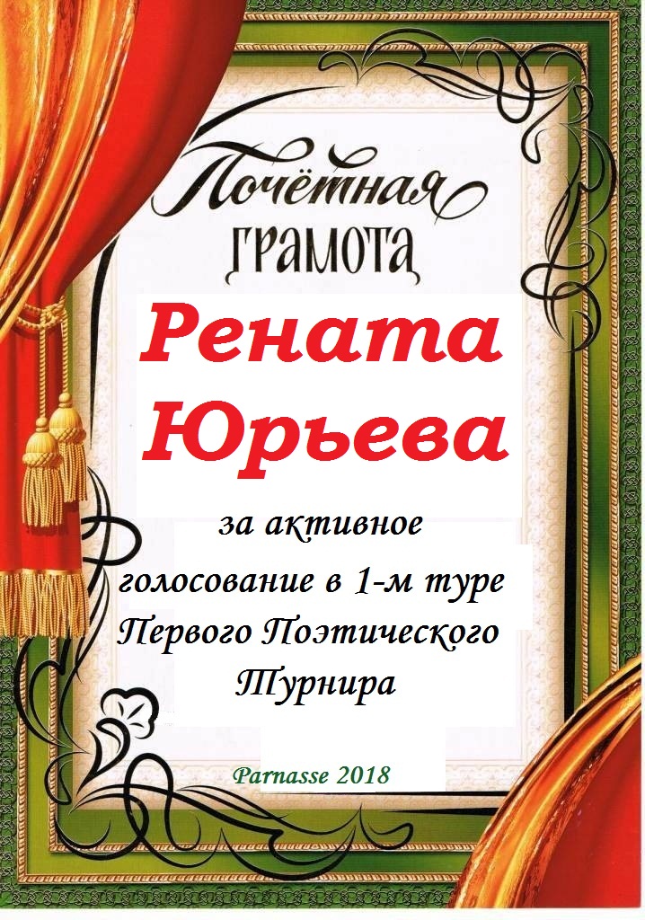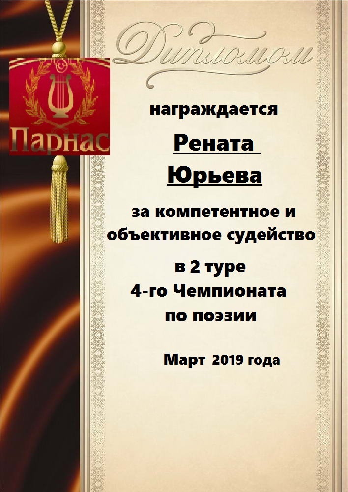 За неугасающую и неисчерпаемую творческую активность, постоянный контакт с Музой и признание сообществом "Парнасцев".От всей души желаем Вам, Рената, здоровья, любви, успехов, благополучия, удачи и творческого вдохновения!