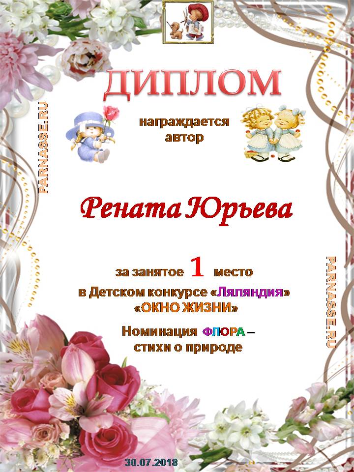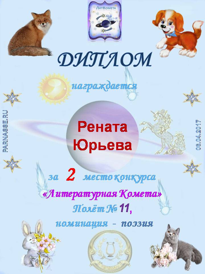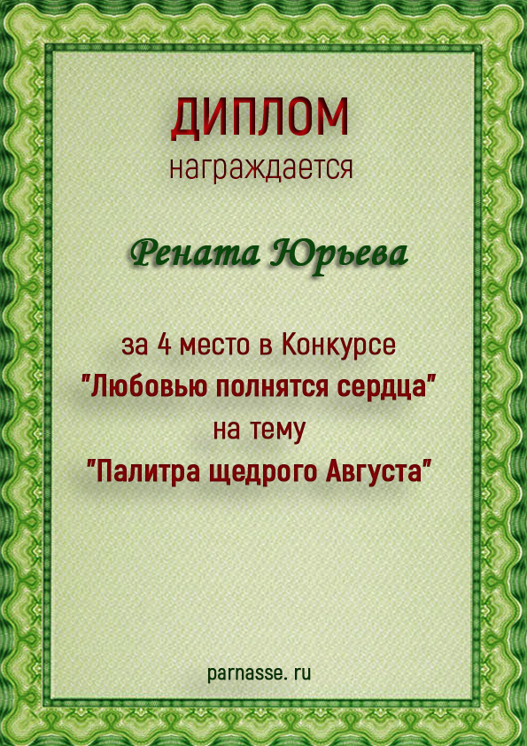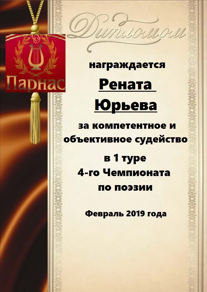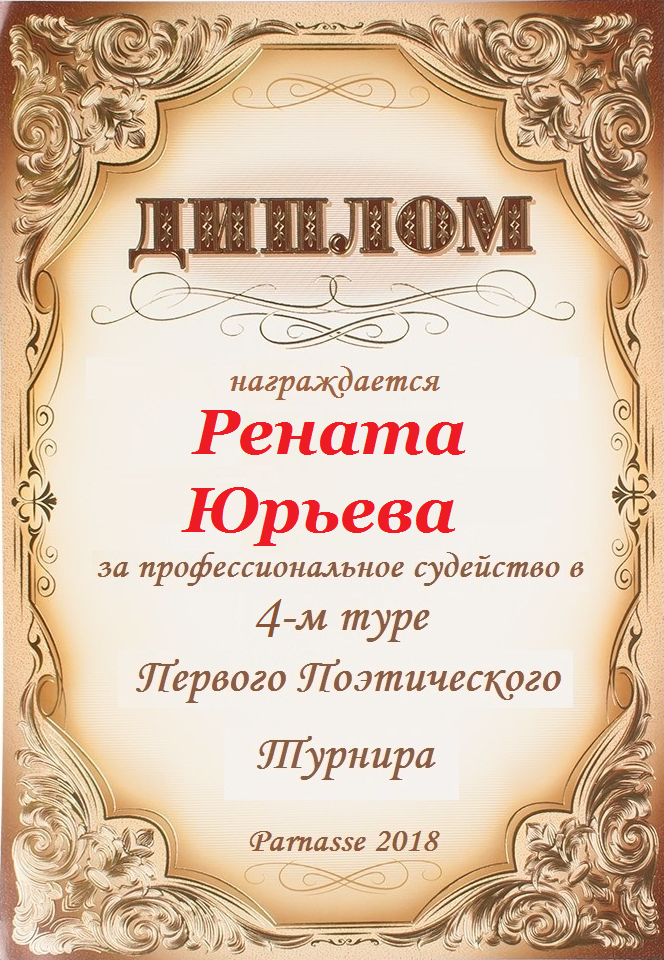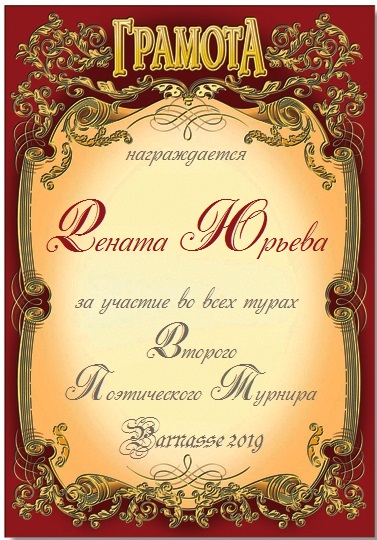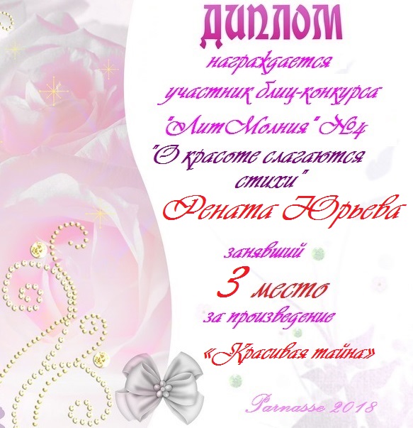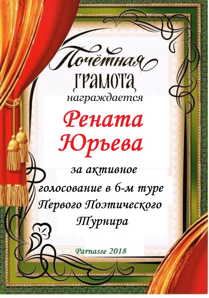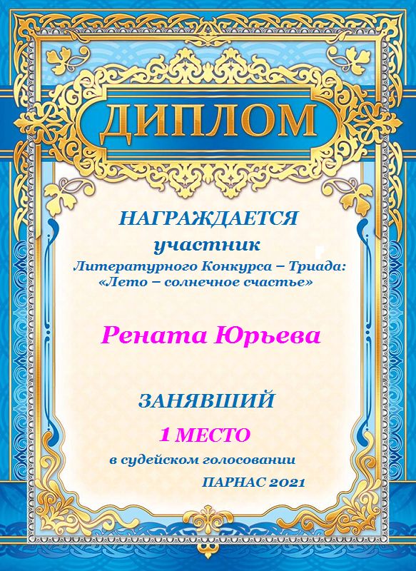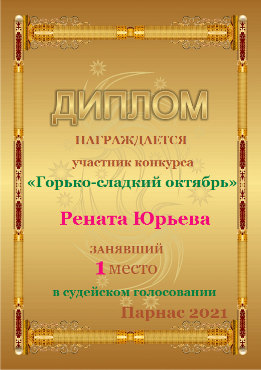 За неугасающую и неисчерпаемую творческую активность, постоянный контакт с Музой и признание сообществом "Парнасцев".От всей души желаем Вам, Рената, здоровья, любви, успехов, благополучия, удачи и творческого вдохновения!