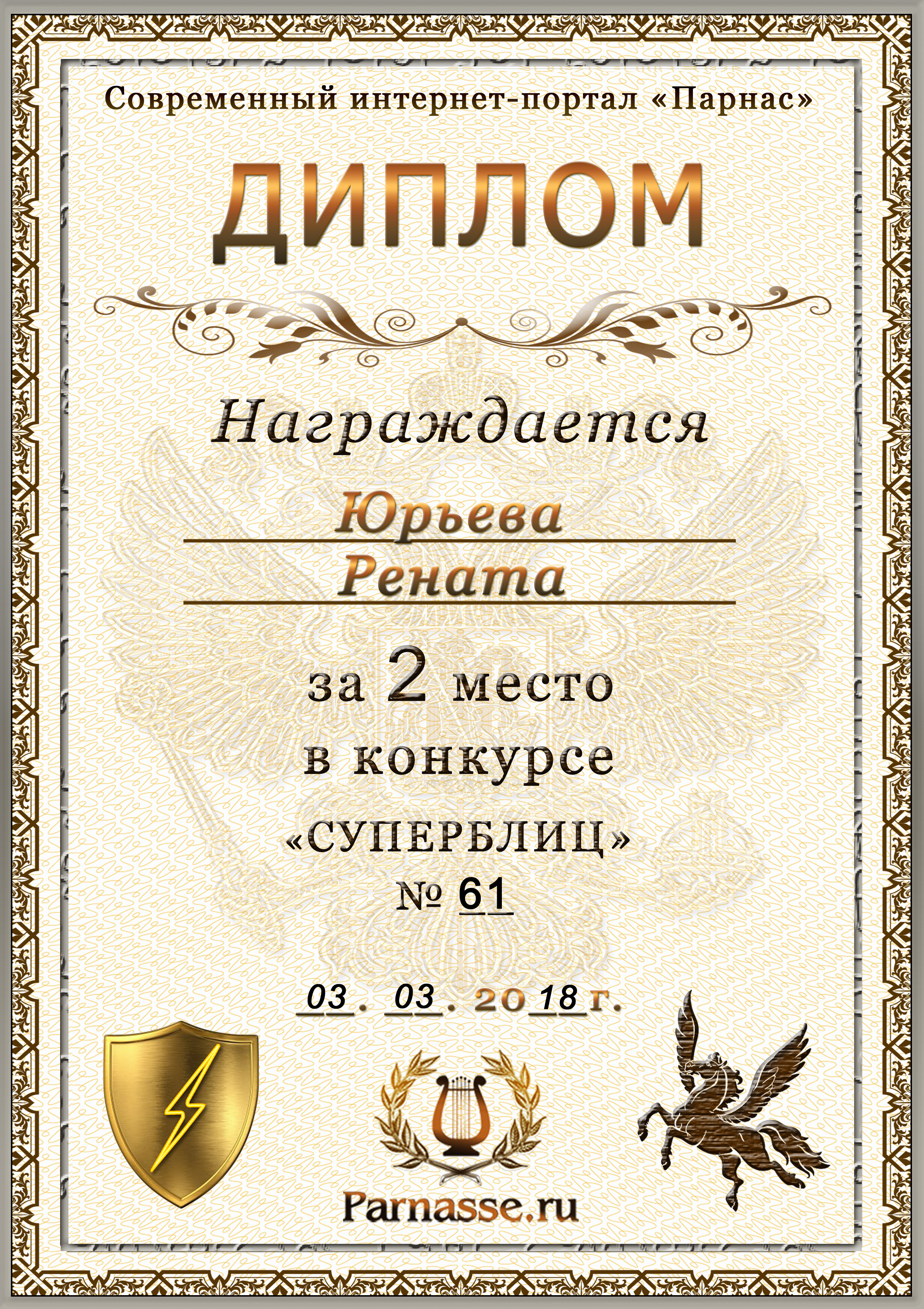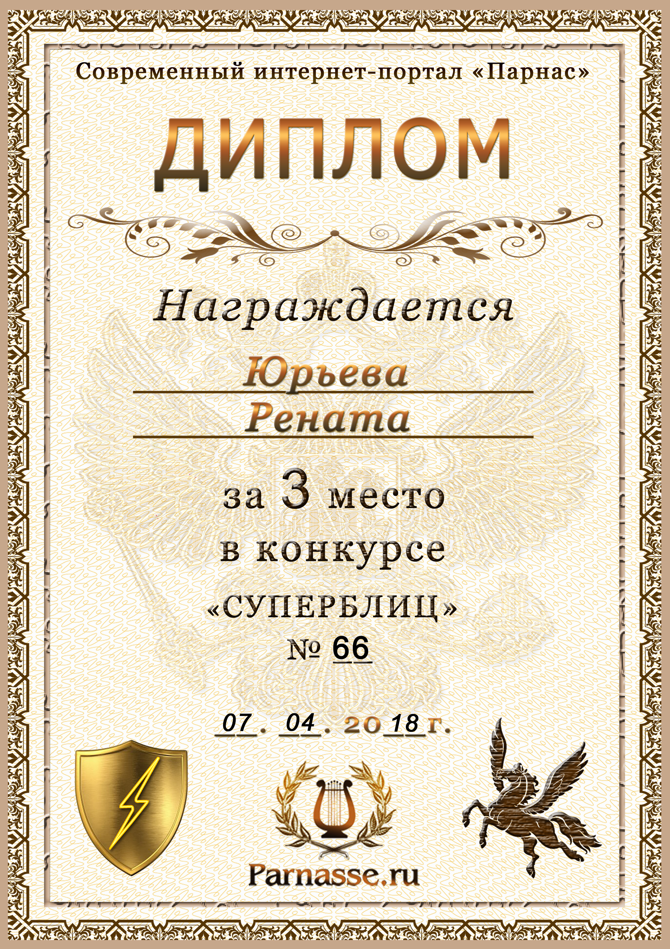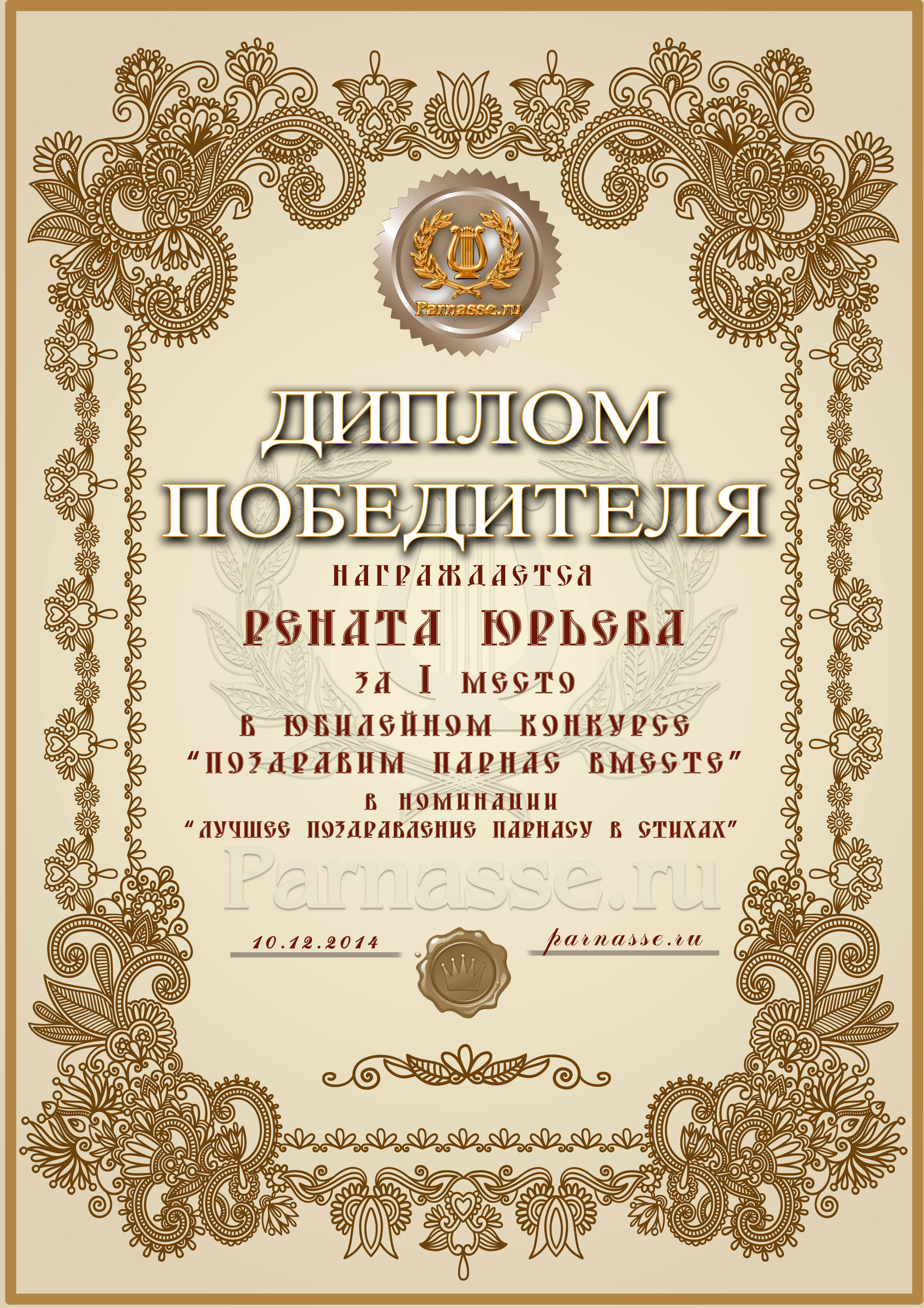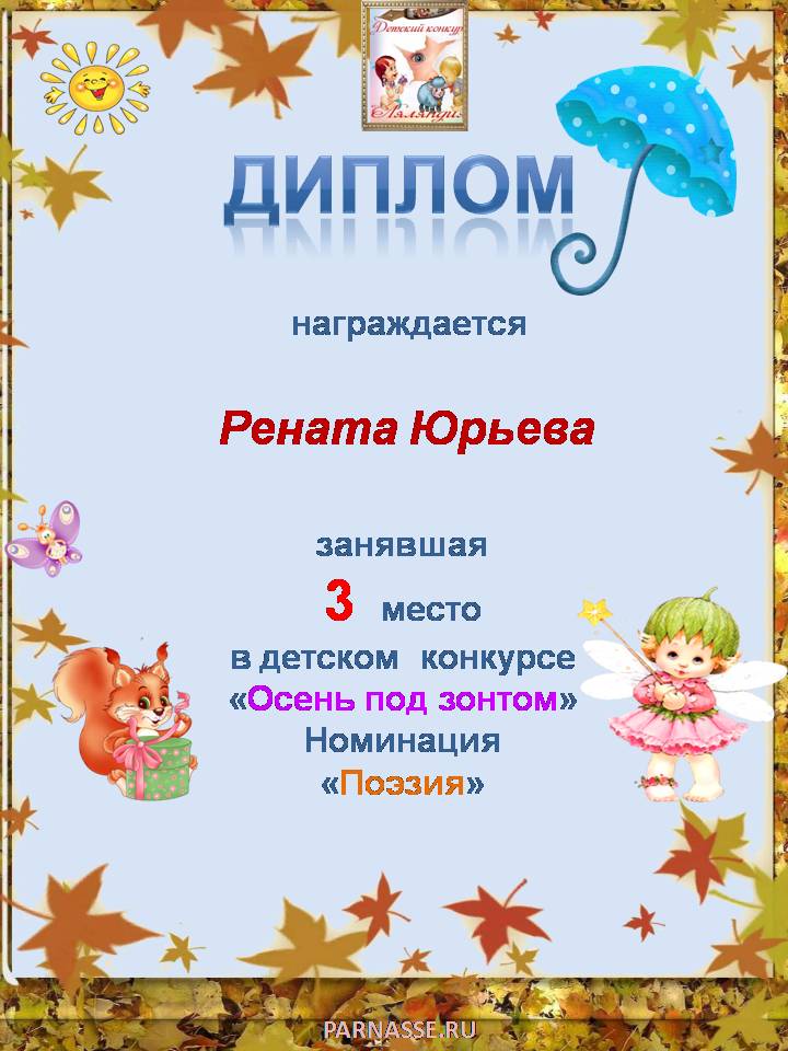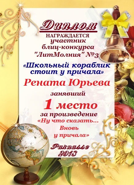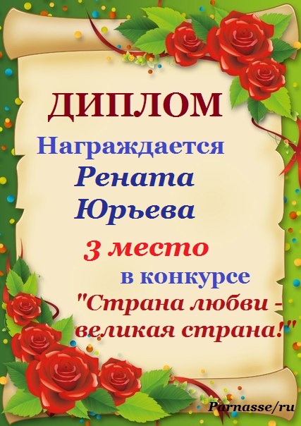 Диплом за 1 место в праздничном конкурсе "Поздравим Парнас с трёхлетием вместе!"