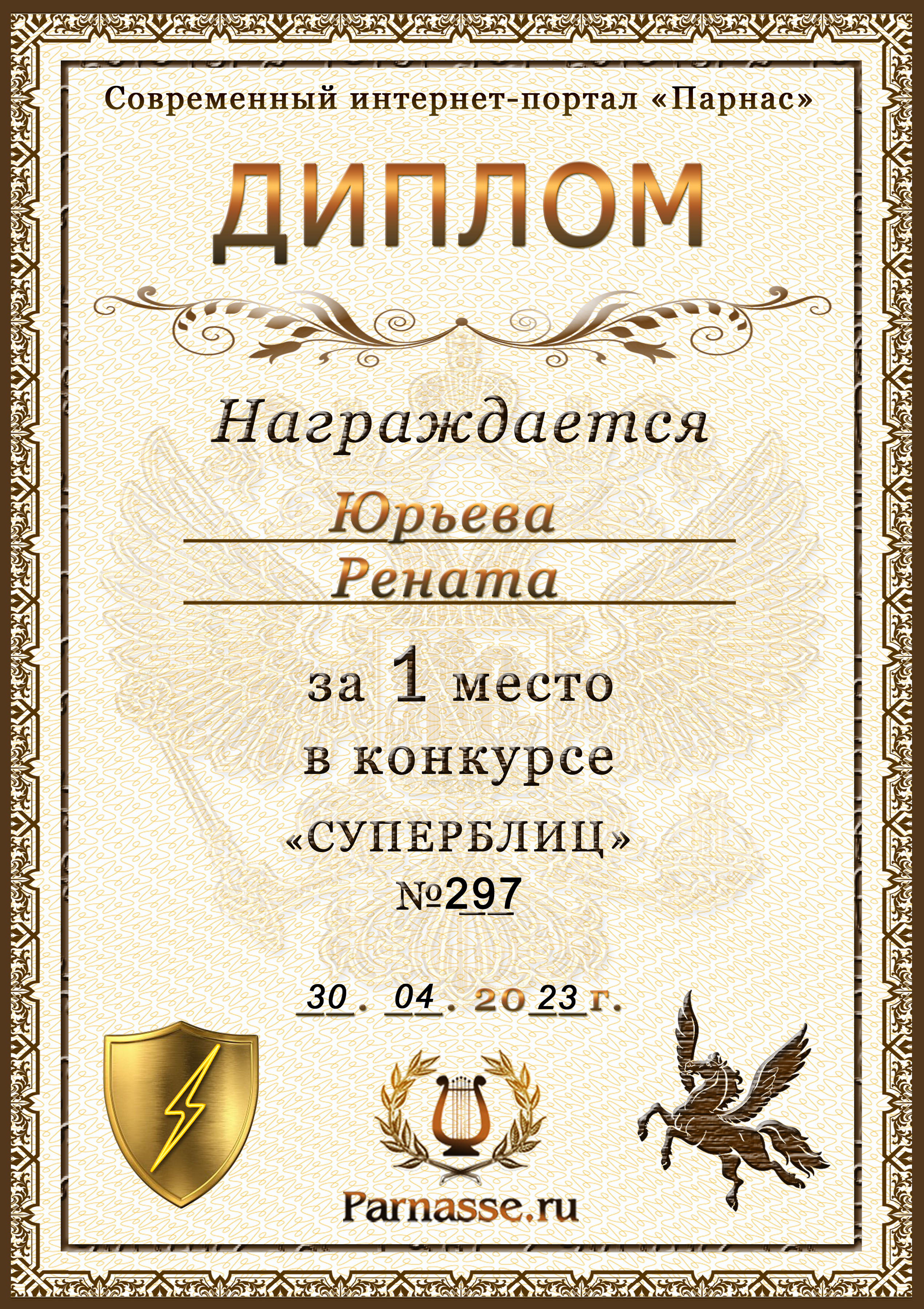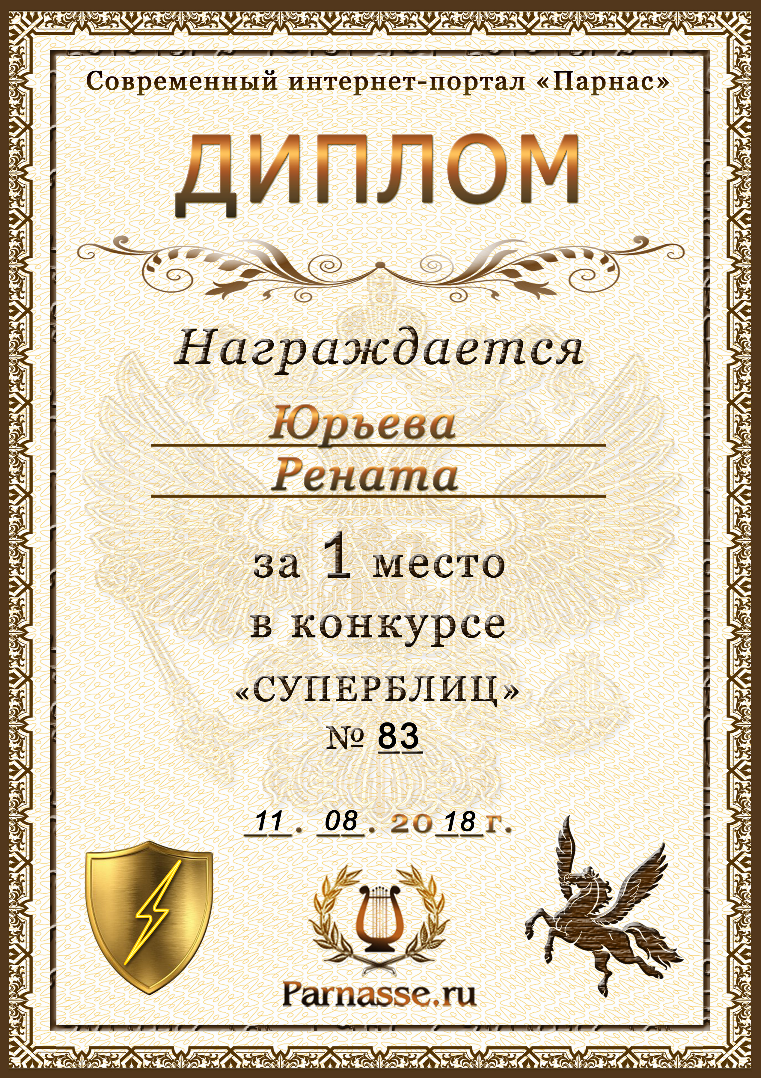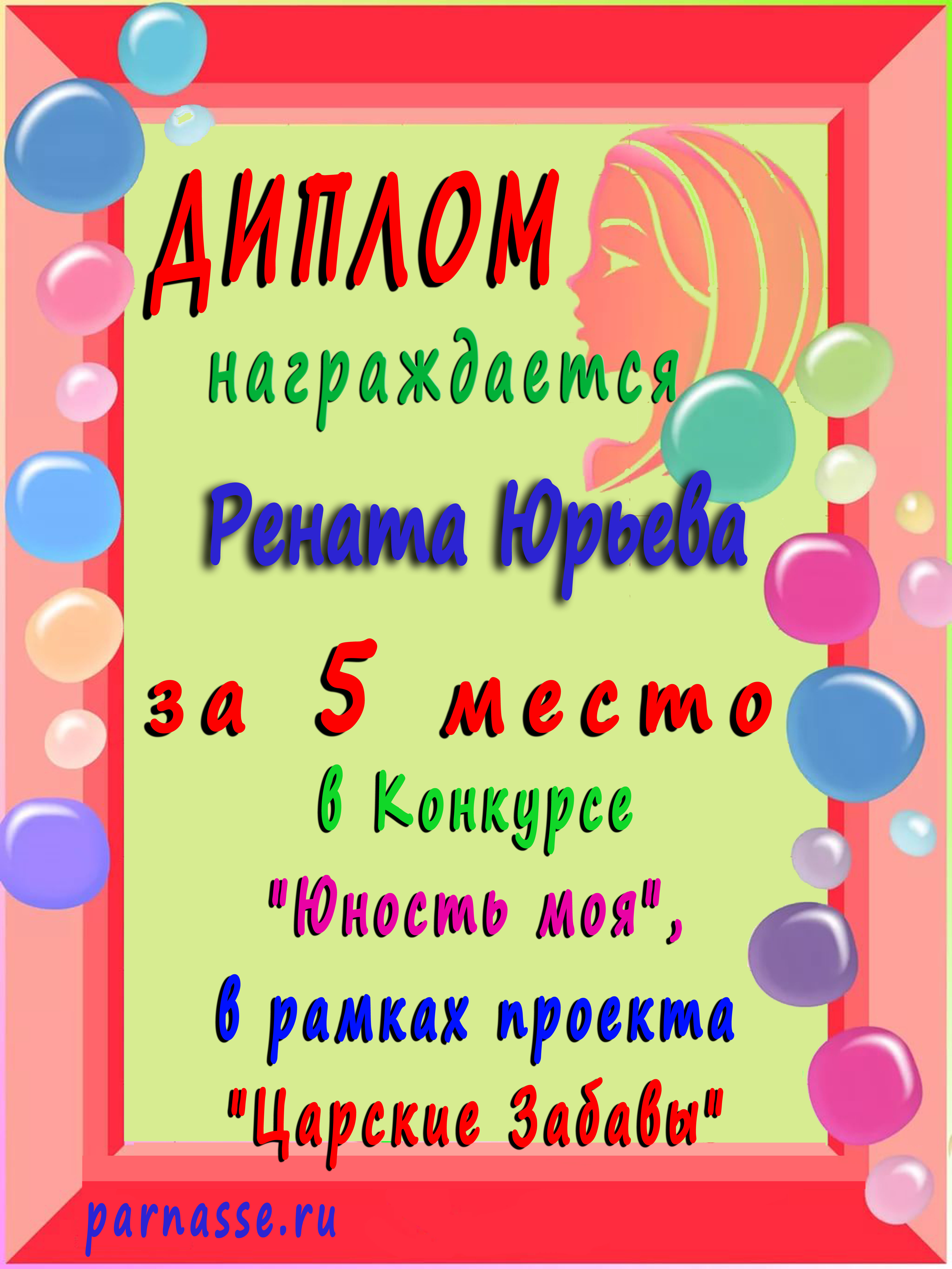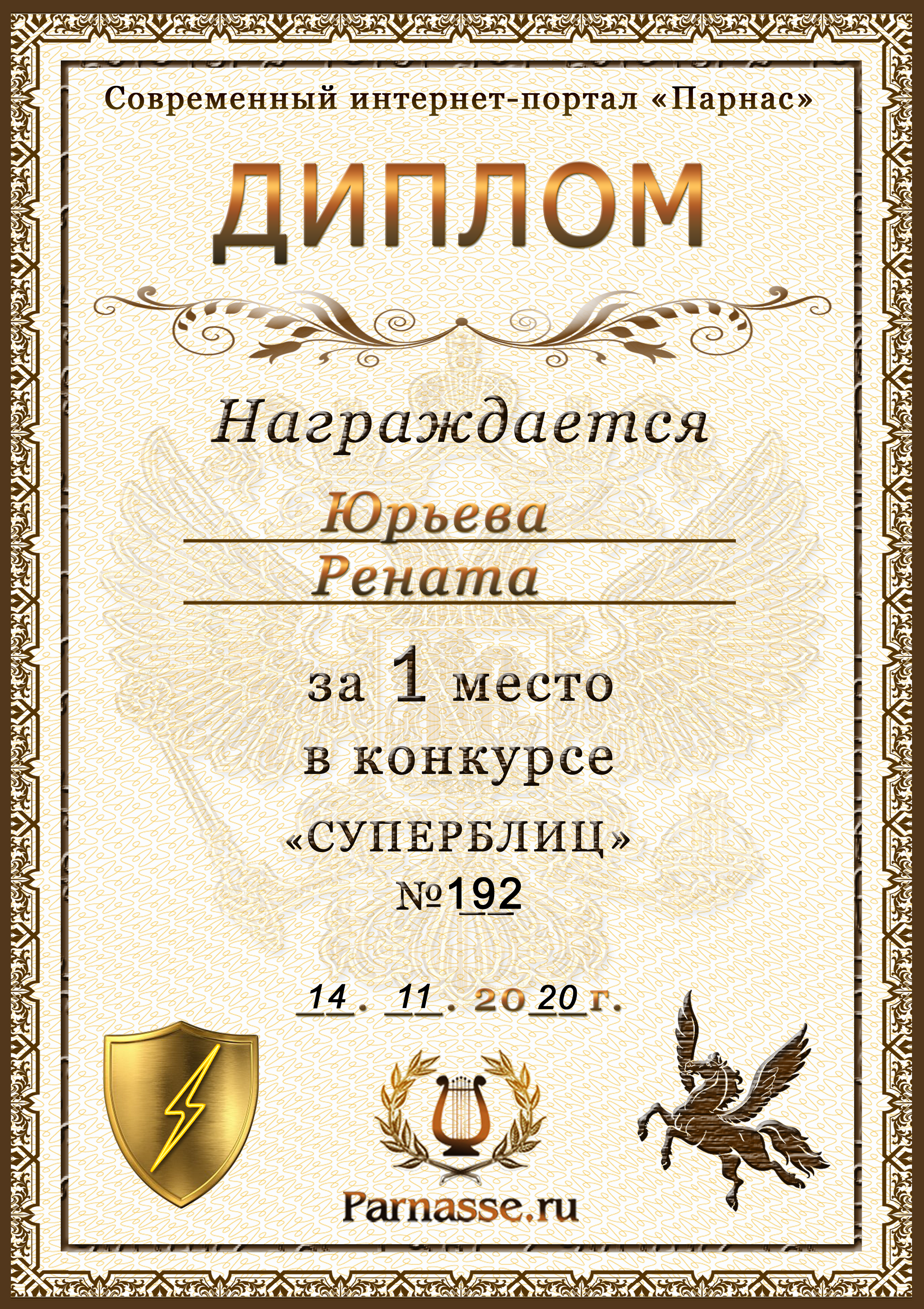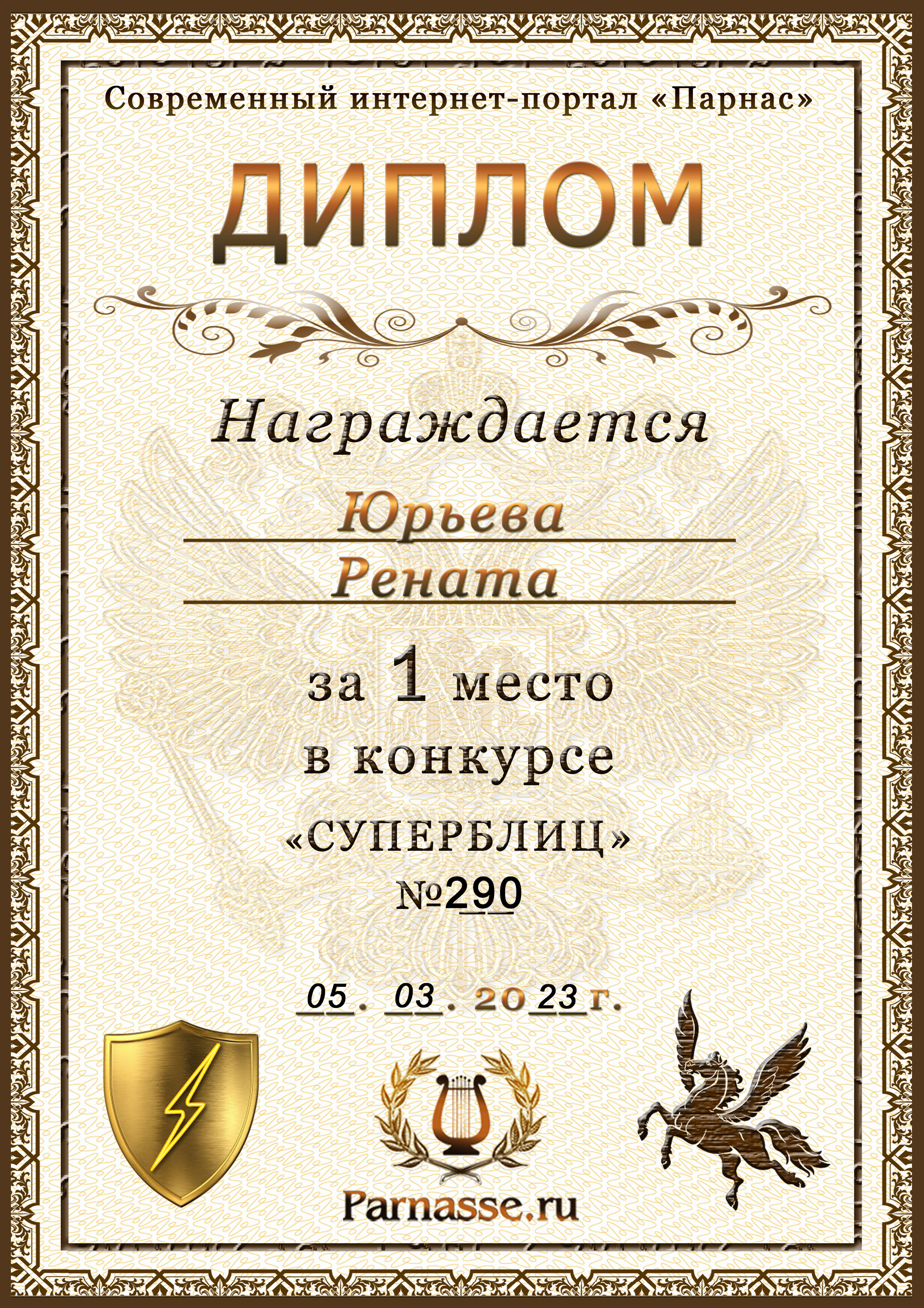 Диплом за 1 место в праздничном конкурсе "Поздравим Парнас с трёхлетием вместе!"