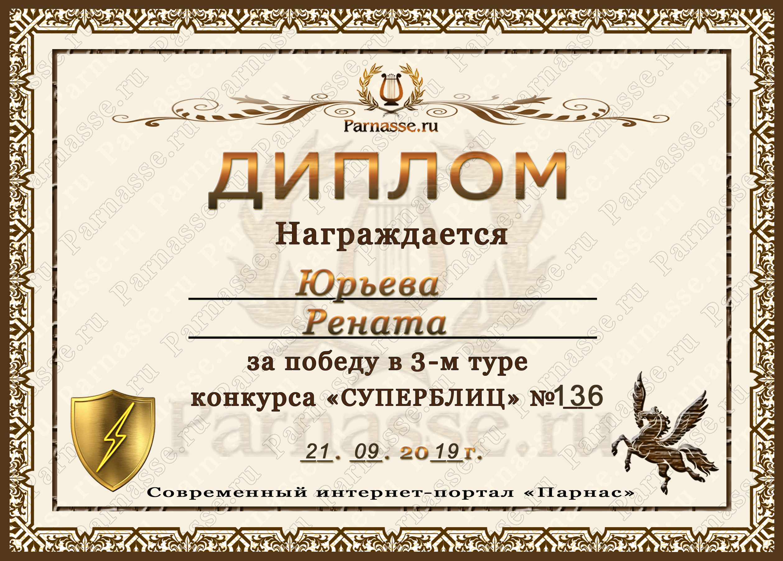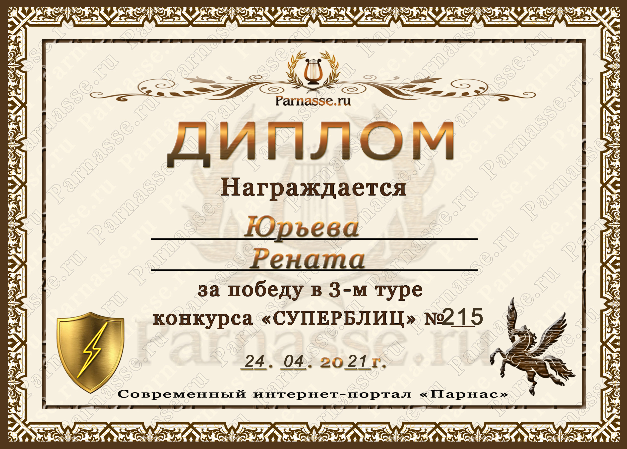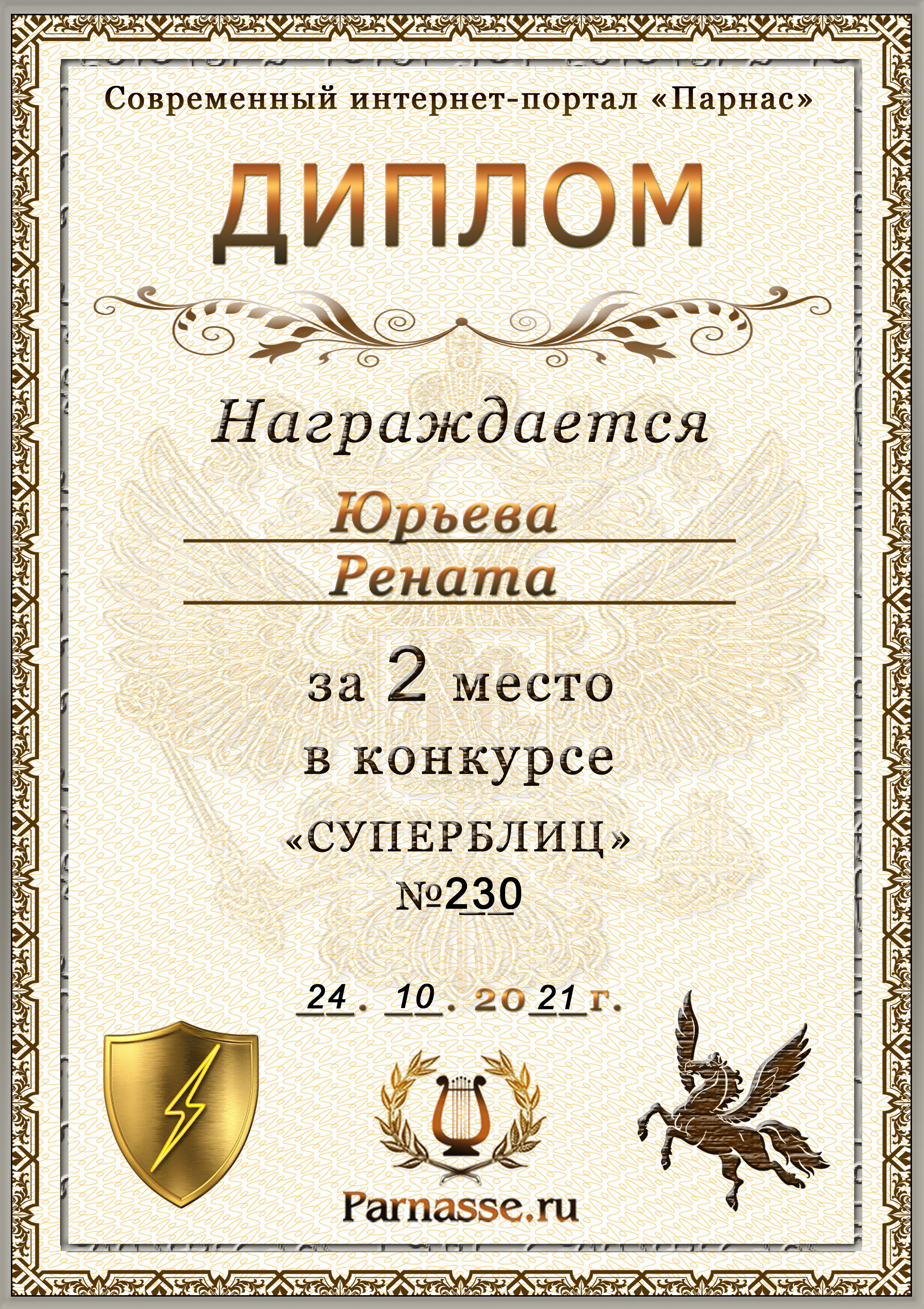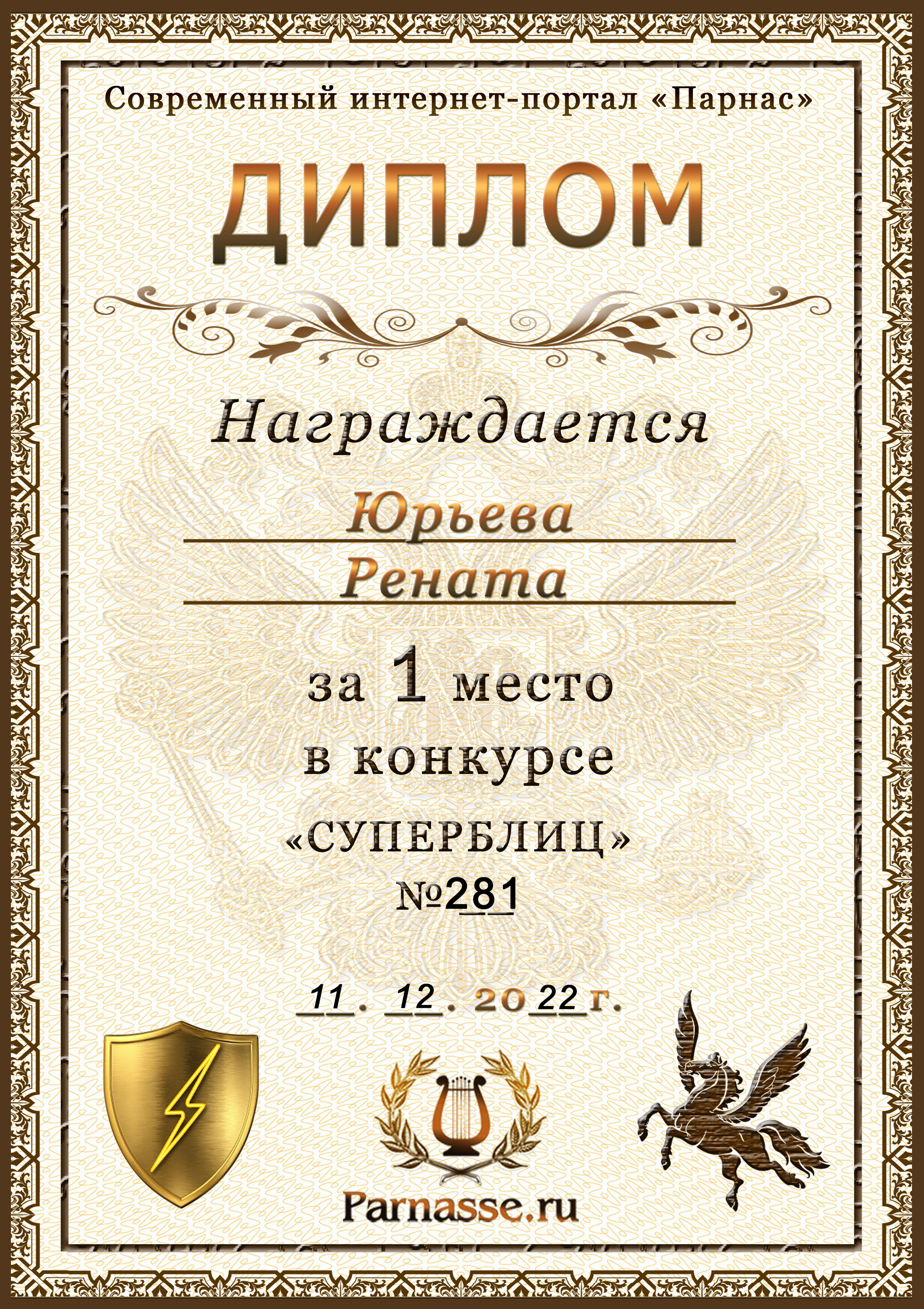 Диплом за 1 место в праздничном конкурсе "Поздравим Парнас с трёхлетием вместе!"