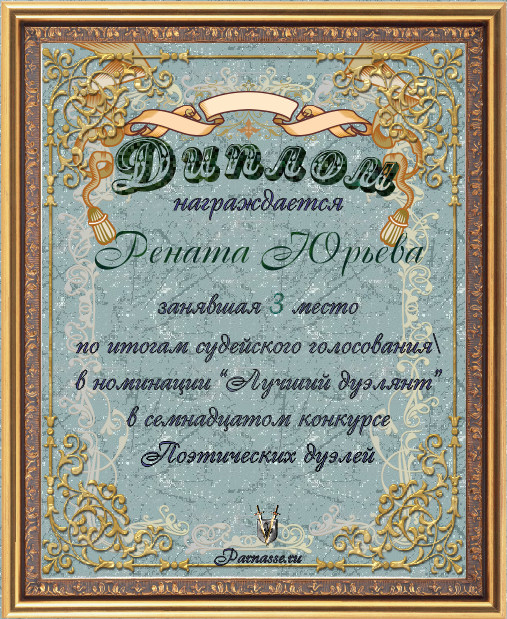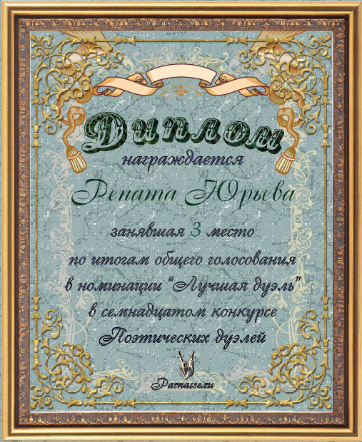 Диплом за 3-е место в номинации "ЛУЧШАЯ ДУЭЛЬ" по итогам общего голосования в 17ом конкурсе поэтических дуэлей (№ 13.1)