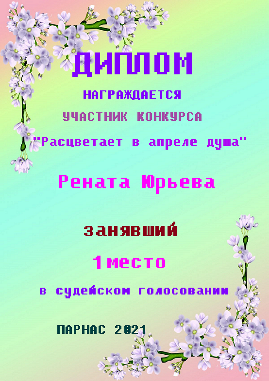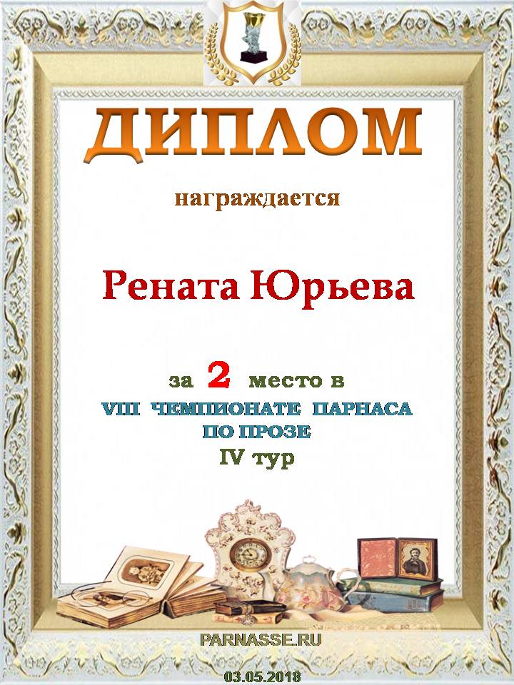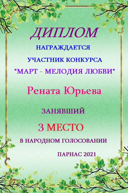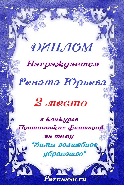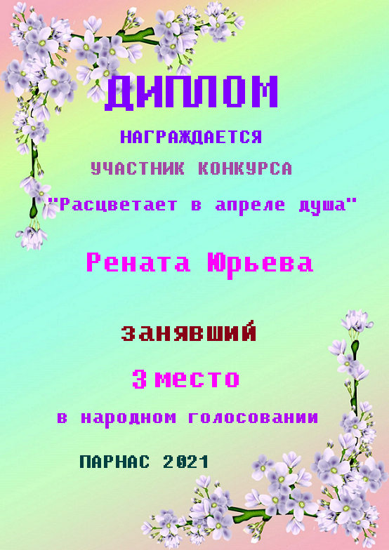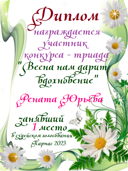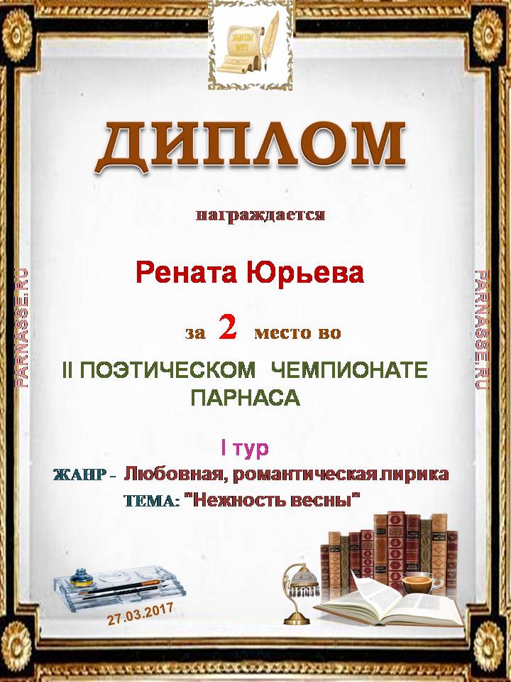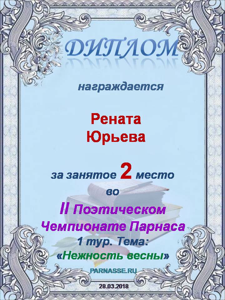 Диплом за 2 место во II Поэтическом Чемпионате Парнаса. I тур . Тема "Нежность весны"