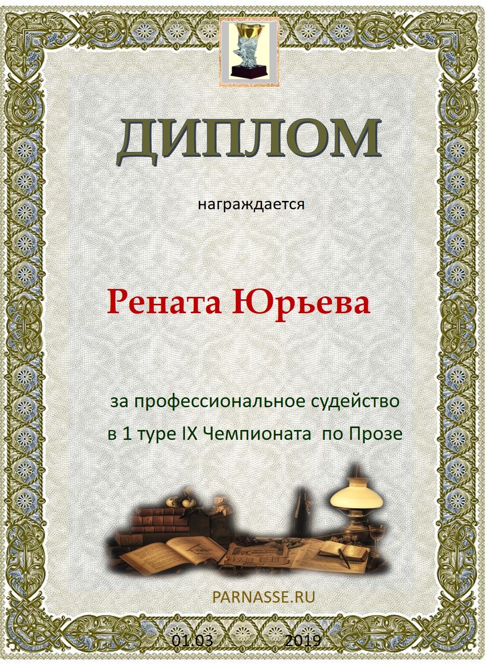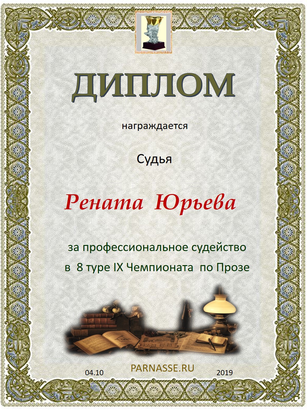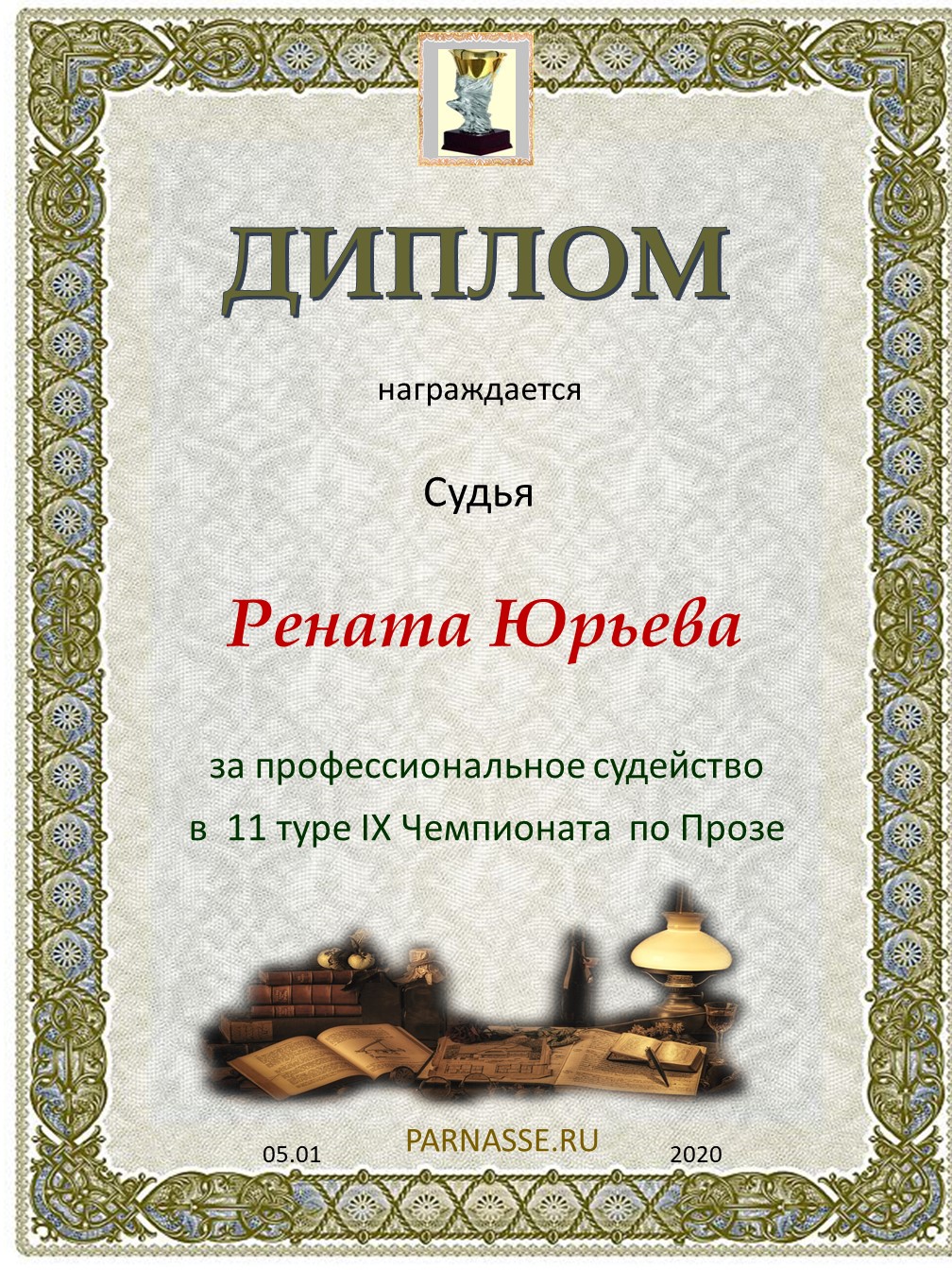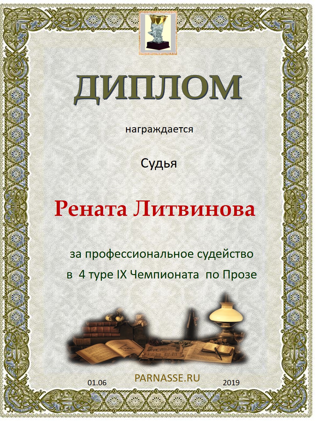 ДИПЛОМ ЗА ПРОФЕССИОНАЛЬНОЕ СУДЕЙСТВО ШЕСТНАДЦАТОГО КОНКУРСА ПОЭТИЧЕСКИХ ДУЭЛЕЙ