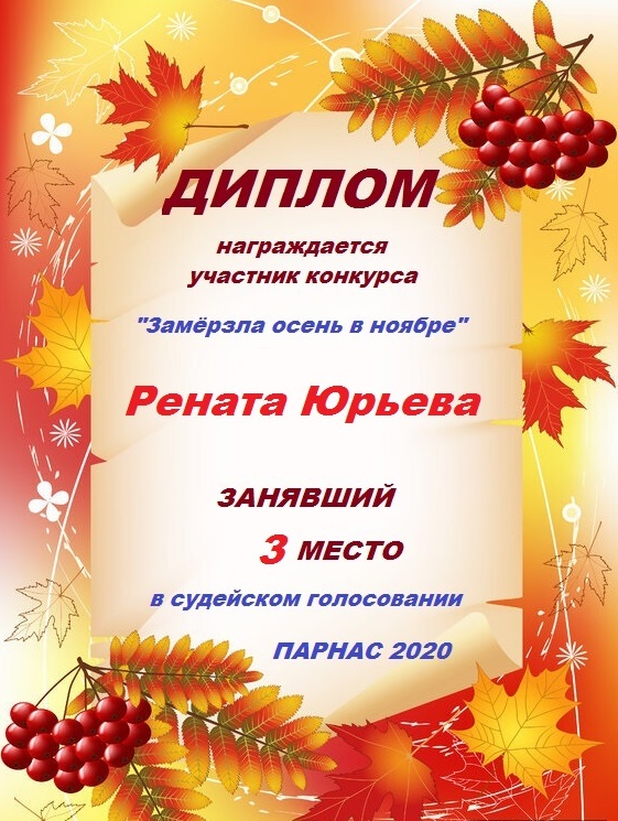 Надеюсь, не стеснит наш Дипломчик стайку твоих заслуженных с других Конкурсов?Поздравляю, Рената! Я очень рад за тебя!