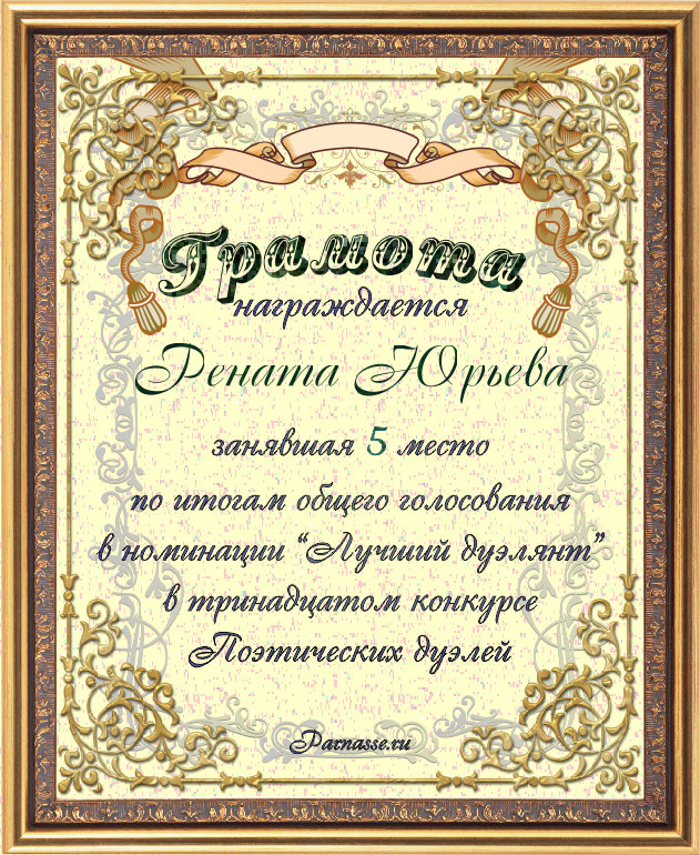 Грамота за 5-е место в номинации "Лучший дуэлянт" по итогам общего голосования в 13м конкурсе поэтических дуэлей