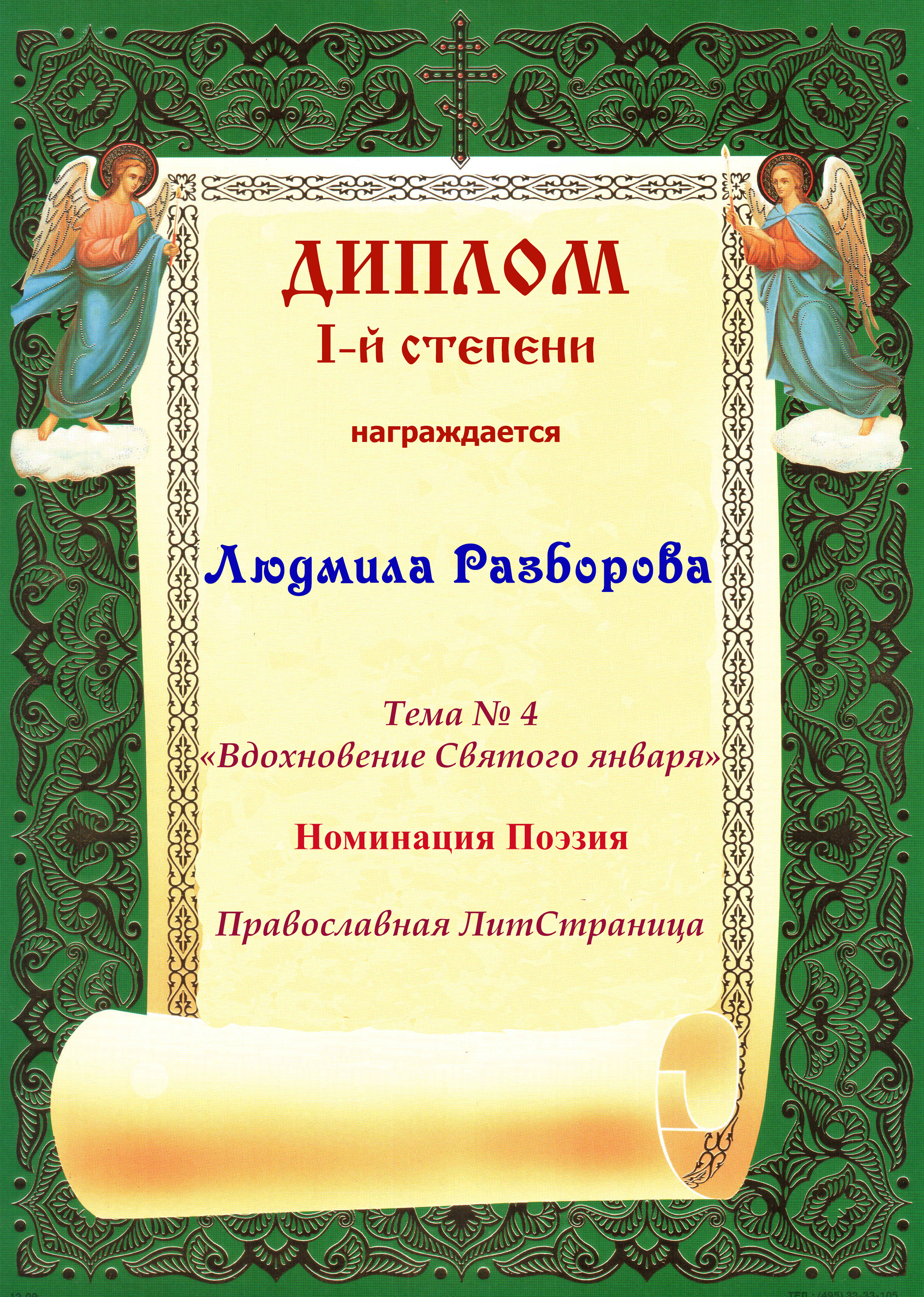 Лауреат II-й степени на Православной ЛитСтранице. Номинация ПОЭЗИЯ. Стихотворение "Старый Новый год".