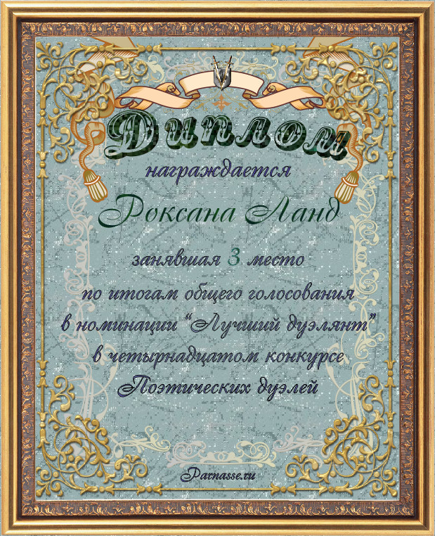 Диплом за 3-е место в номинации "ЛУЧШАЯ ДУЭЛЬ" по итогам общего голосования в 14ом конкурсе поэтических дуэлей (№ 26.1)