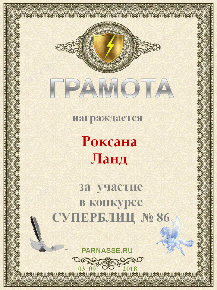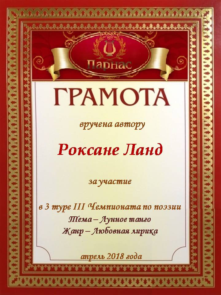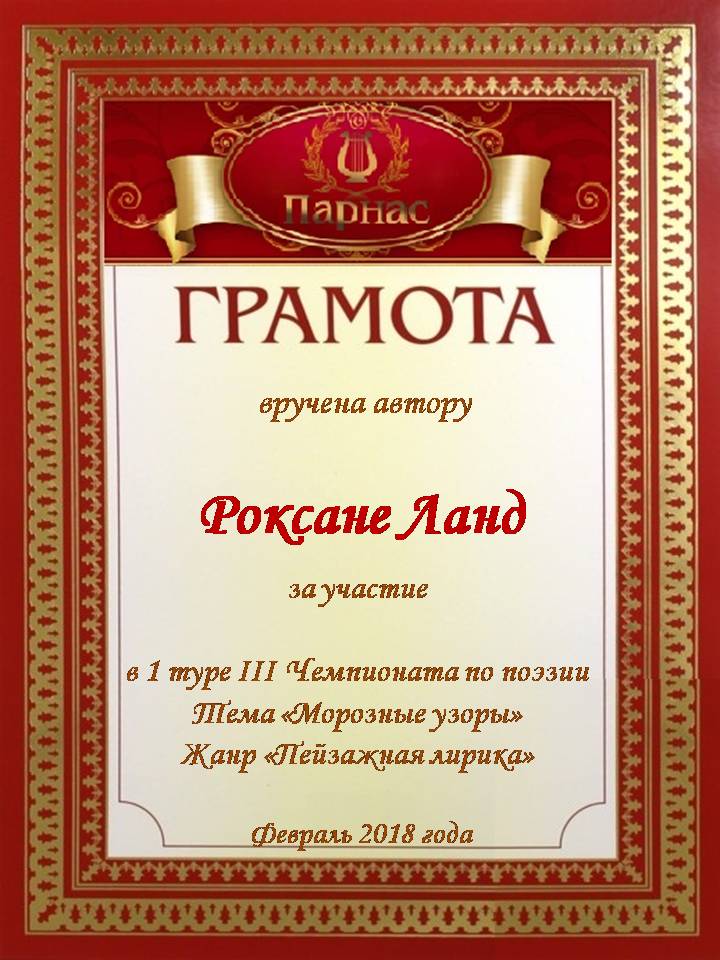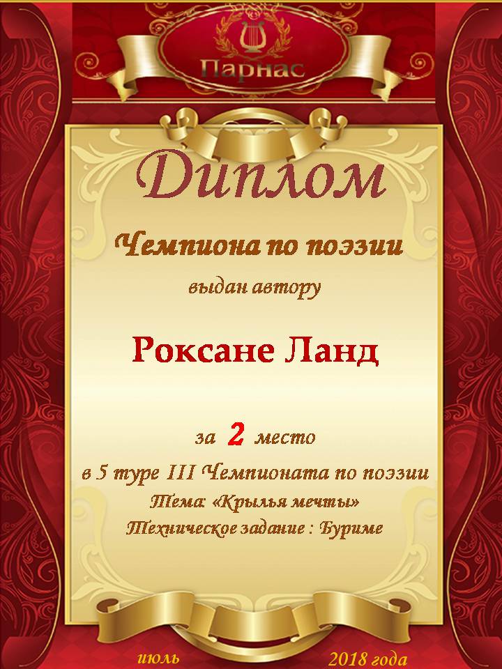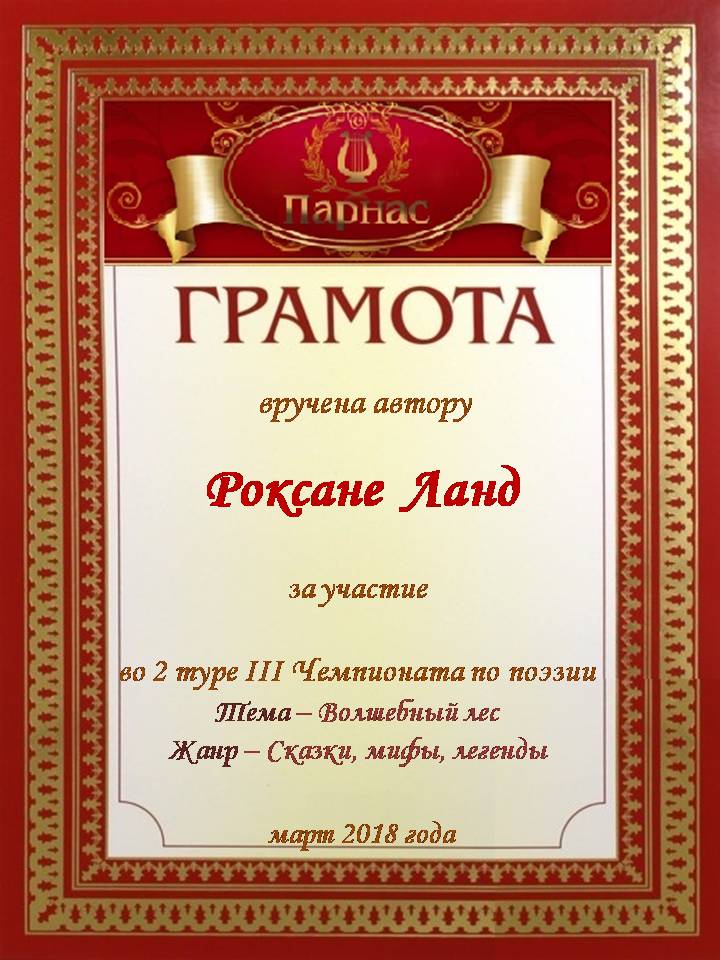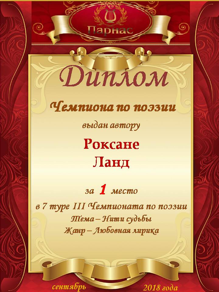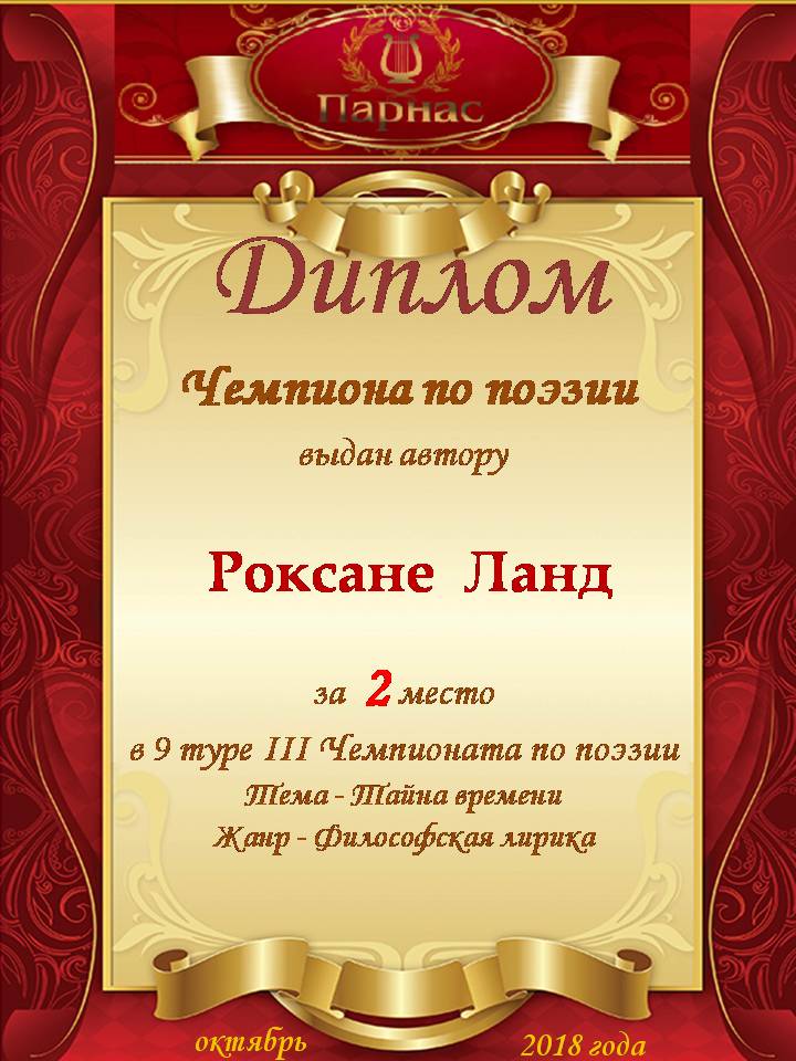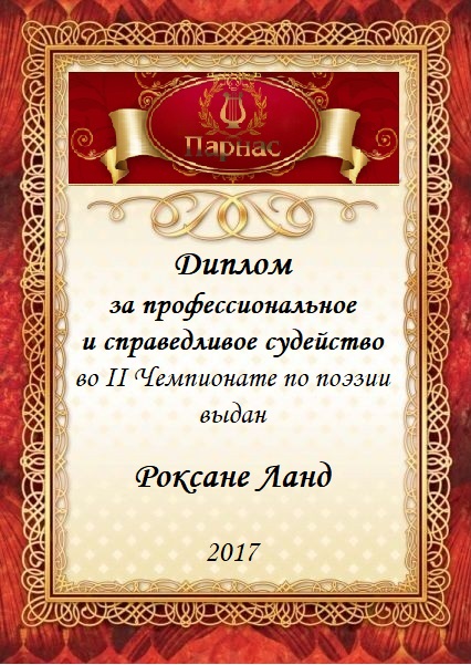 За профессиональное, компетентное, объективное, беспристрастное, квалифицированное, справедливое Главное Судейство II Чемпионата Парнаса по Поэзии! Огромное СПАСИБО, Роксана!