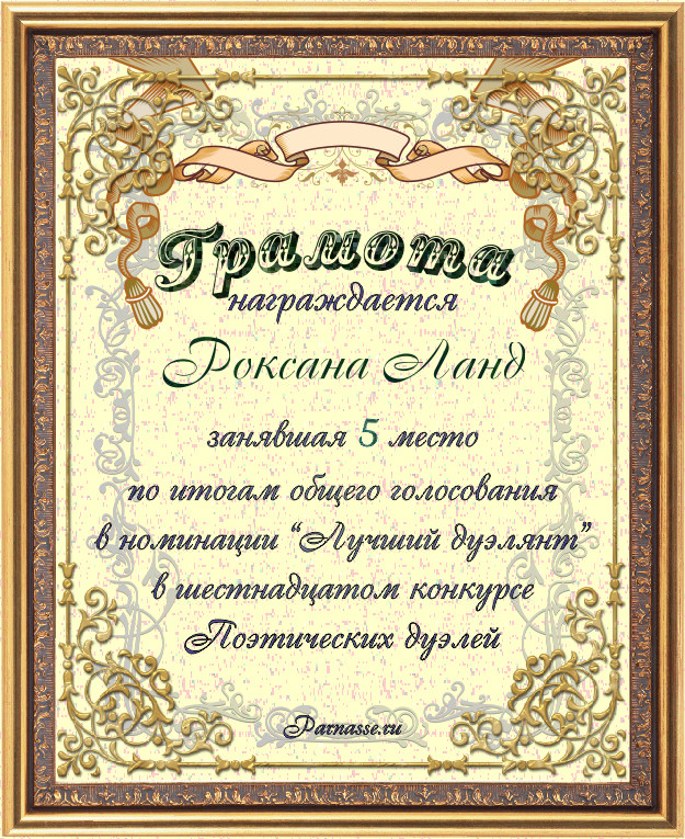 Грамота за 5-е место в номинации "ЛУЧШИЙ ДУЭЛЯНТ" по итогам общего голосования в 16ом конкурсе поэтических дуэлей