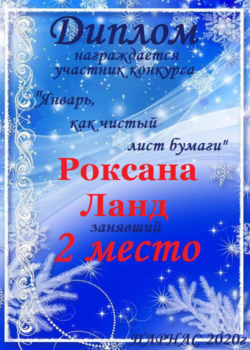 Первое место по итогам серии зимних конкурсов " Белая сказка зимы", в номинации «Поэзия». Поздравляем с прекрасной победой!