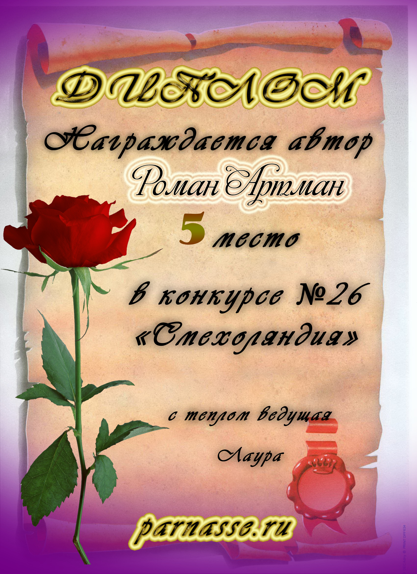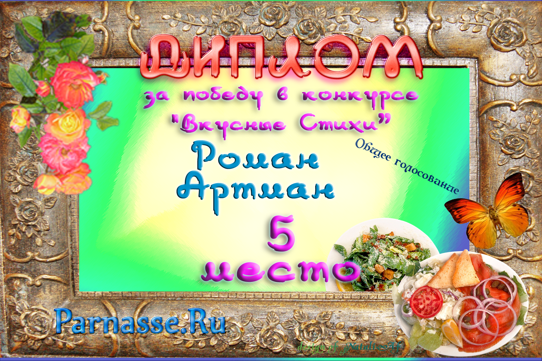 Уважаемый Роман!От всего сердца поздравляем Вас с блестящей ПОБЕДОЙ в номинации «Вкусная ПОЭЗИЯ», во "Вкусном конкурсе"