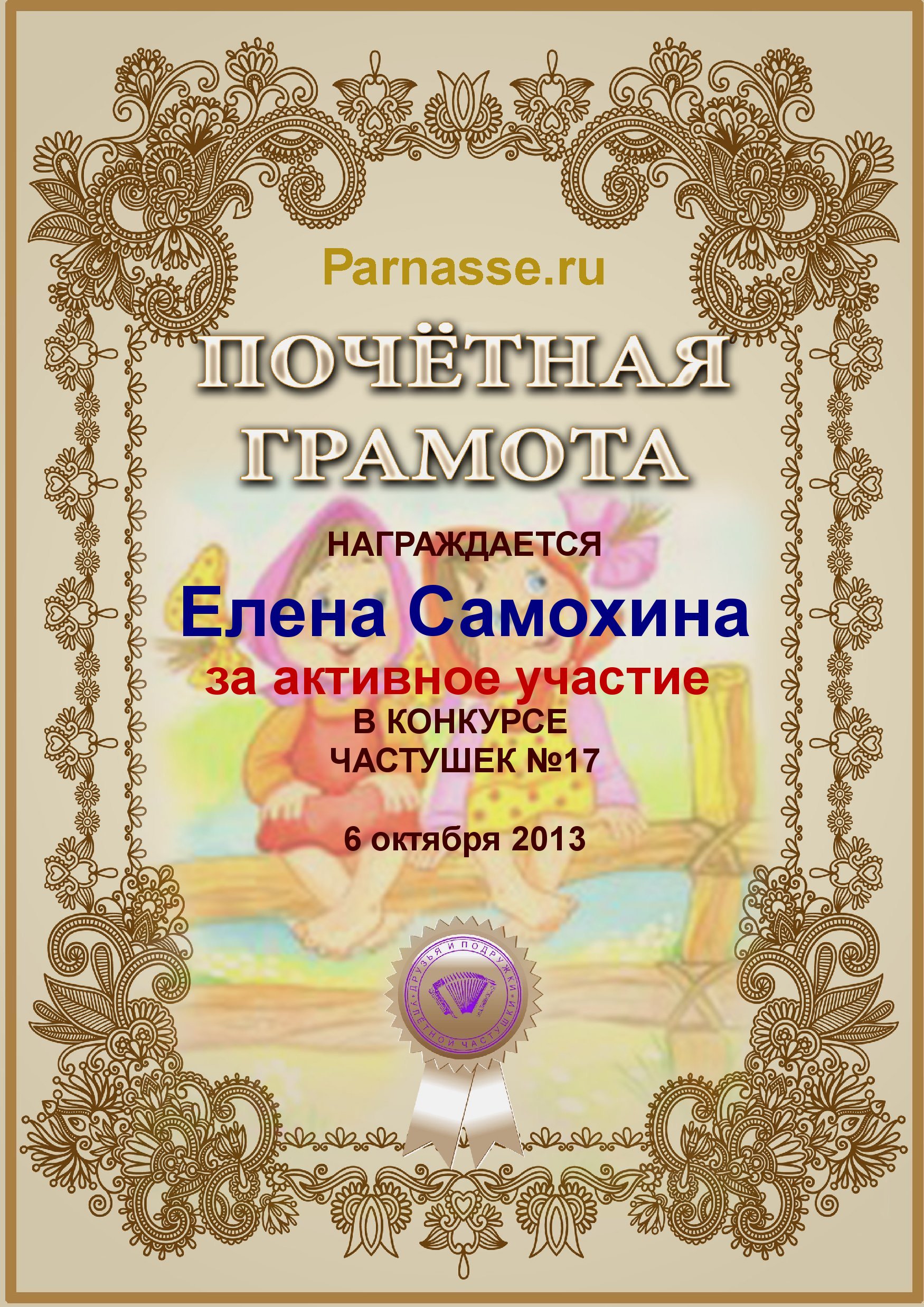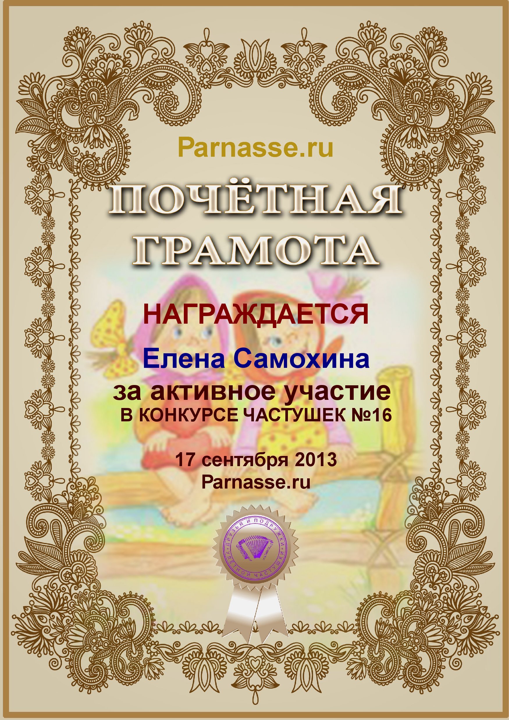 Похвальная грамота за активное участие в конкурсе лимериков № 46+ (9.12.2013 г.)