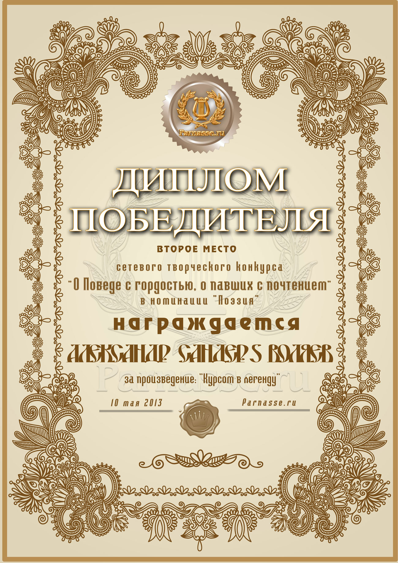Второе место в музыкально-литературном конкурсе «О Победе с гордостью, о павших – с почтением!» Судейское голосование. Номинация в поэзии «Ваш Подвиг бессмертен»! Произведение «Курсом в легенду»! Поздравляем с блестящей победой!