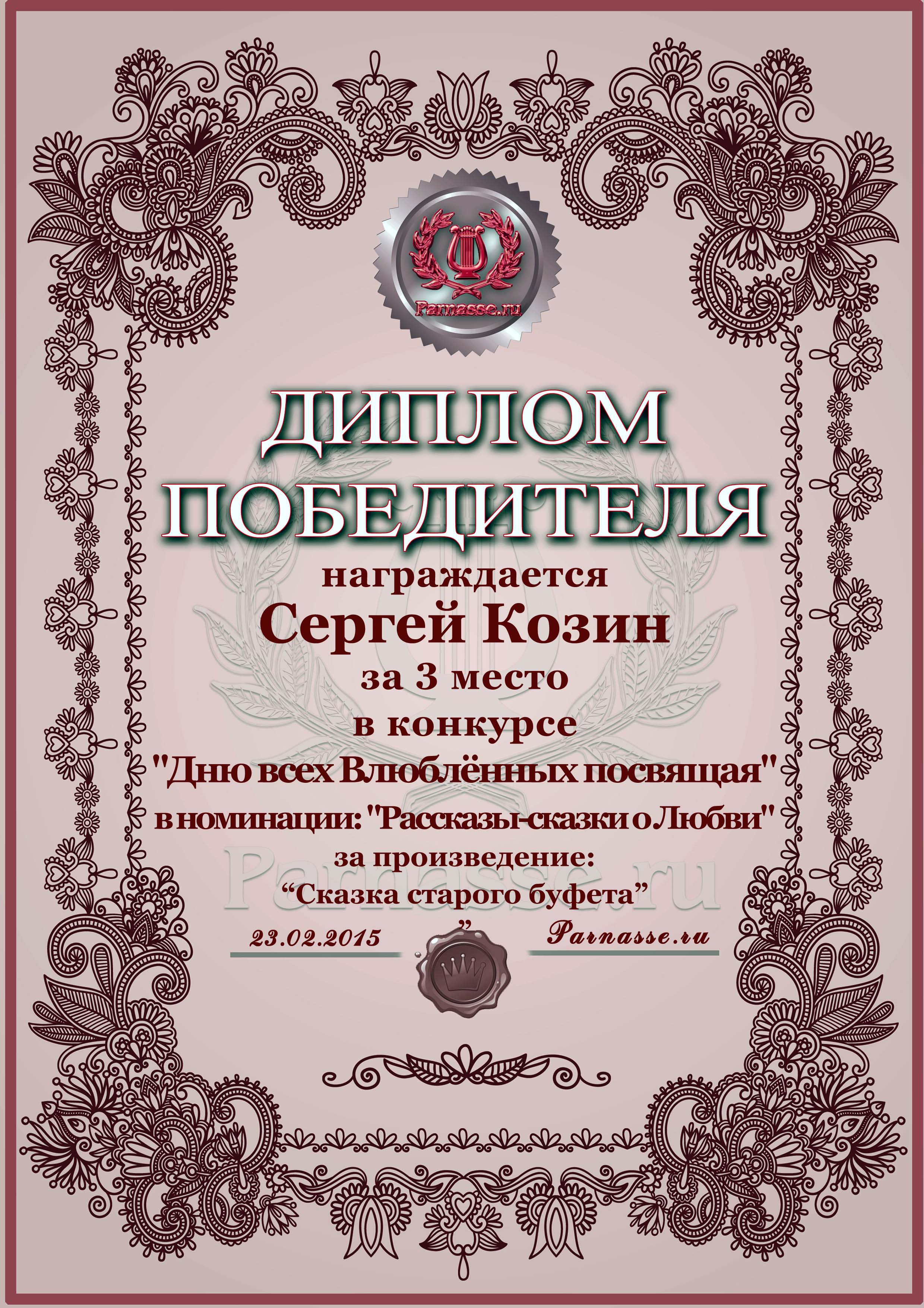 Третье место в конкурсе "Дню всех Влюблённых посвящая", прозаическая номинация, судейское голосование, произведение "Сказка старого буфета". Поздравляем!