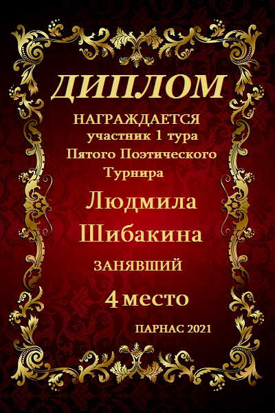 Четвёртое место в 1-м туре Пятого Поэтического Турнира «Признание в любви», за произведение «Времени следы». Поздравляем!