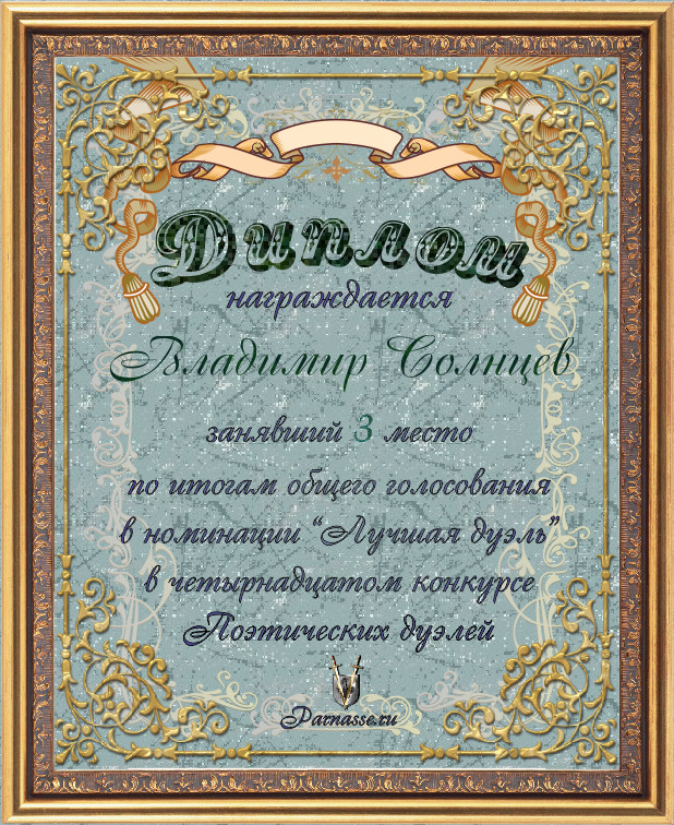 Диплом за 3-е место в номинации "ЛУЧШАЯ ДУЭЛЬ" по итогам общего голосования в 14ом конкурсе поэтических дуэлей (№ 23.1)